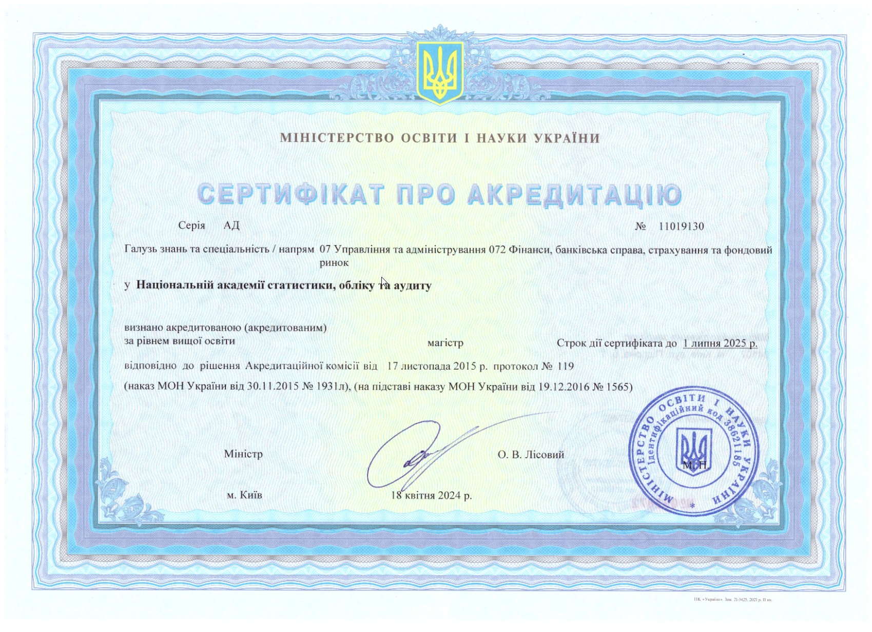Сертифікати про акредитацію Національної академії статистики, обліку та аудиту від Міністерства освіти і науки України.