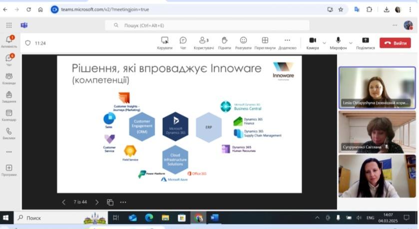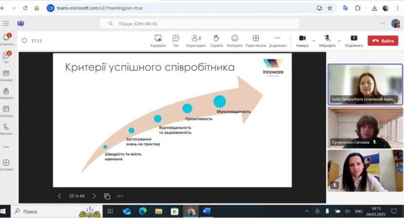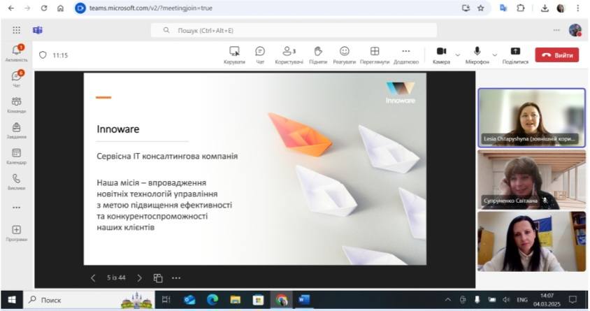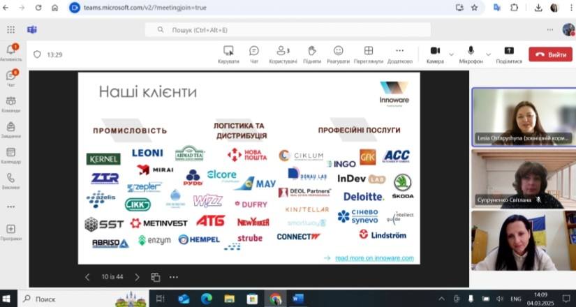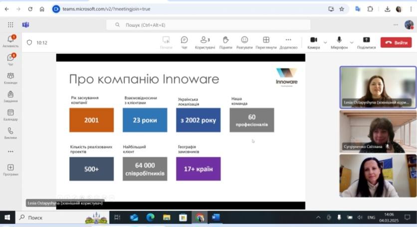 On March 4, as part of strengthening the cooperation between the Department of Statistics, IT and Mathematical Methods in Economics of the National Academy of Statistics, Accounting and Audit with business, a working meeting took place. The meeting included the Vice-Rector for Scientific, Pedagogical and Educational Work, PhD in Economics, Associate Professor S. Suprunenko, the Head of the Department, PhD in Economics, Associate Professor O. Horobets, and the HR manager of Innoware company – Lesya Ostapyshyna.