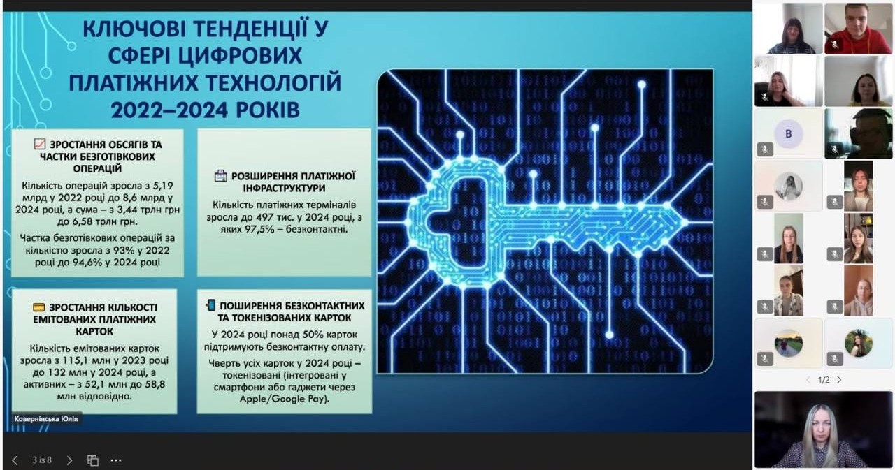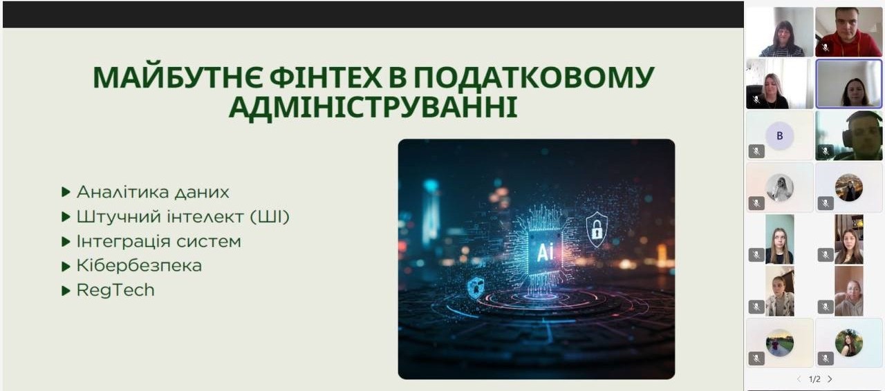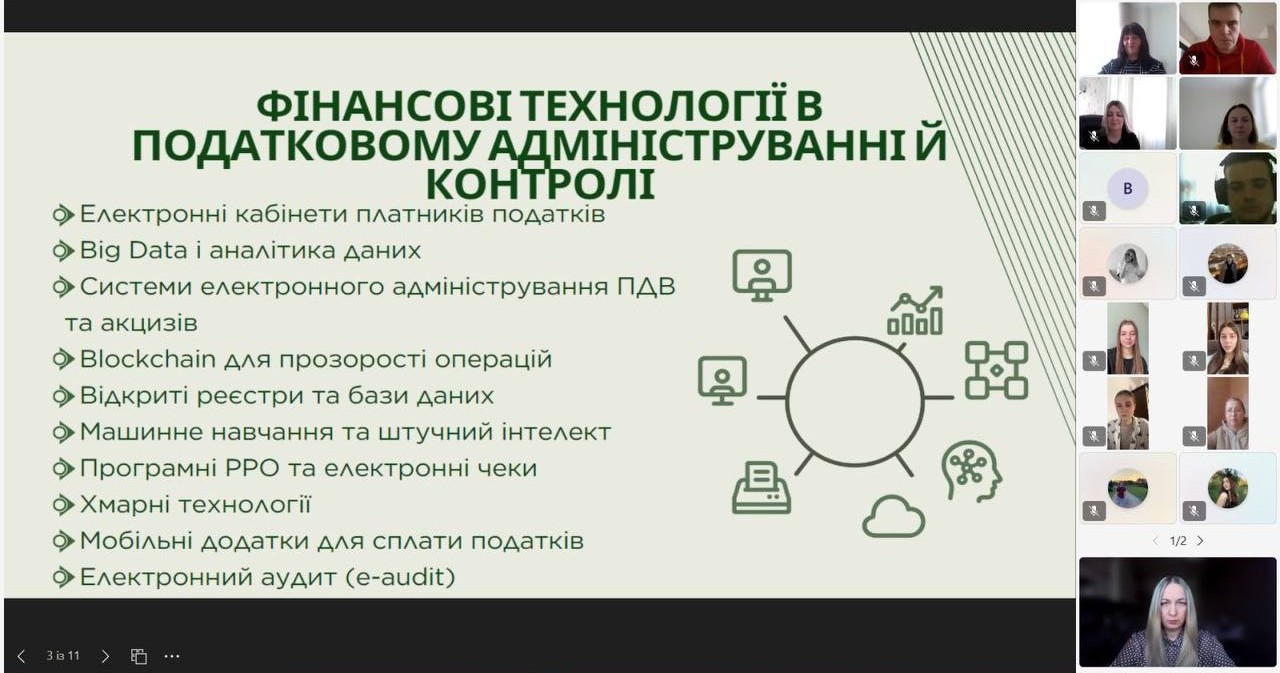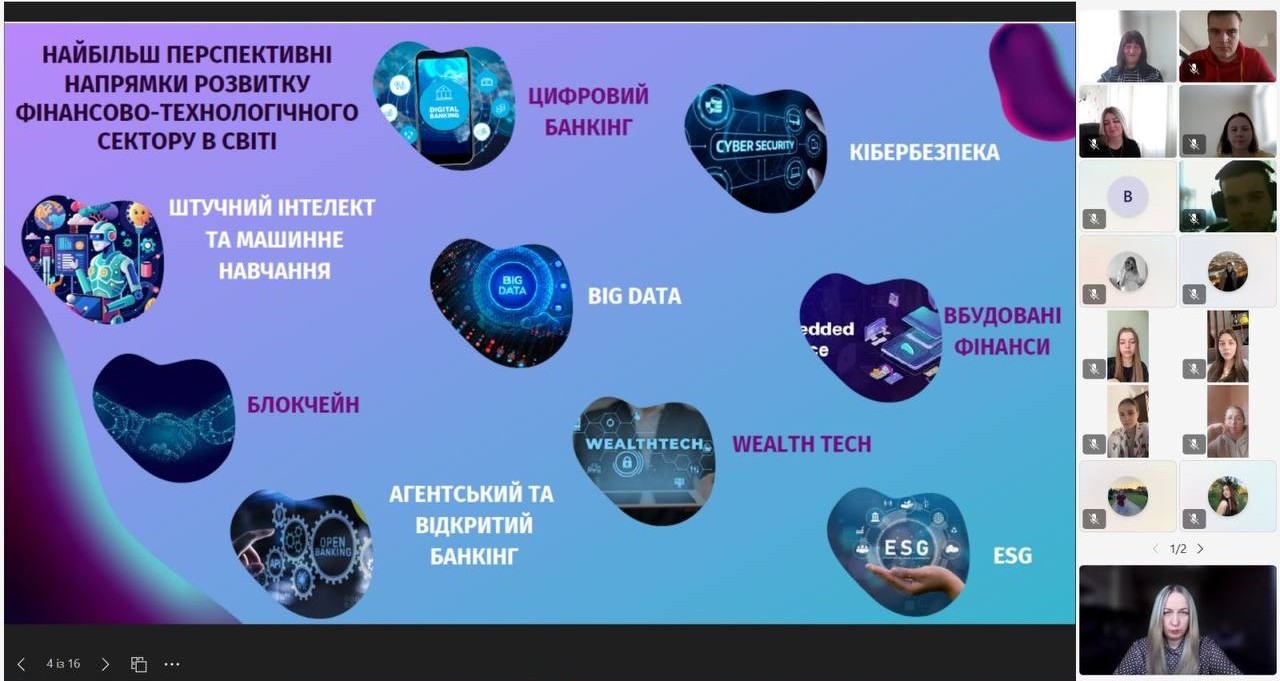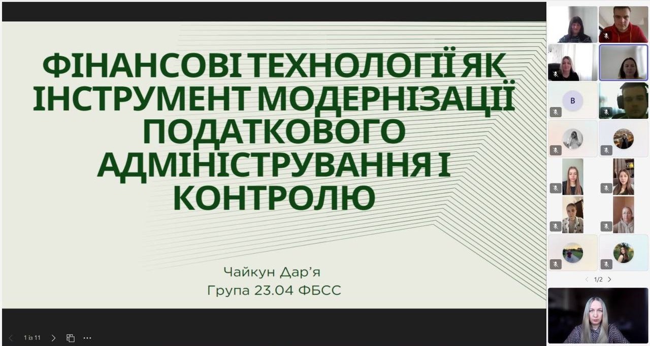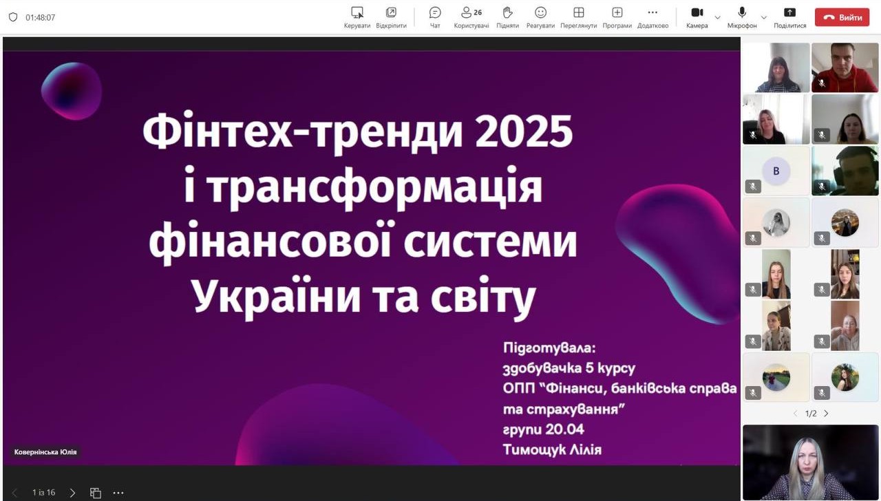 Учасниці гуртка представили свої доповіді. Тимощук Лілія, здобувачка 1 курсу другого (магістерського) рівня вищої освіти, групи 20.04, презентувала огляд ключових фінтех трендів 2025 року, таких як штучний інтелект та машинне навчання, блокчейн, агентський та відкритий банкінг, Big Data, кібербезпека, ESG, вбудовані фінанси, цифровий банкінг, WealthTech та їх вплив на фінансову систему України і світу. Кобзенко Маргарита, здобувачка 2 курсу першого (бакалаврського) рівня вищої освіти, групи 23.04, розповіла про роль цифрових платіжних технологій у розвитку фінансової системи України. Вона акцентувала увагу на їхньому впливі на безпеку, зручність і прозорість фінансових операцій, навела динаміку основних показників у цій сфері за 2022–2024 роки, а також розглянула питання кібербезпеки в платіжному середовищі та необхідність підвищення фінансової грамотності населення. Чайкун Дар’я, здобувачка 2 курсу першого (бакалаврського) рівня вищої освіти, групи 23.04, висвітлила особливості застосування фінансових технологій для модернізації податкового адміністрування та контролю через цифровізацію податкових процесів. У своїй доповіді вона зосередилася на інструментах цифровізації, що використовуються для автоматизації збору податків, обробки податкової звітності та здійснення контролю за дотриманням податкового законодавства.
