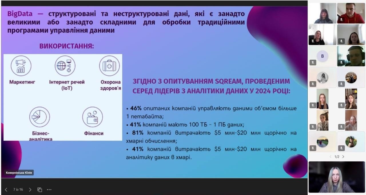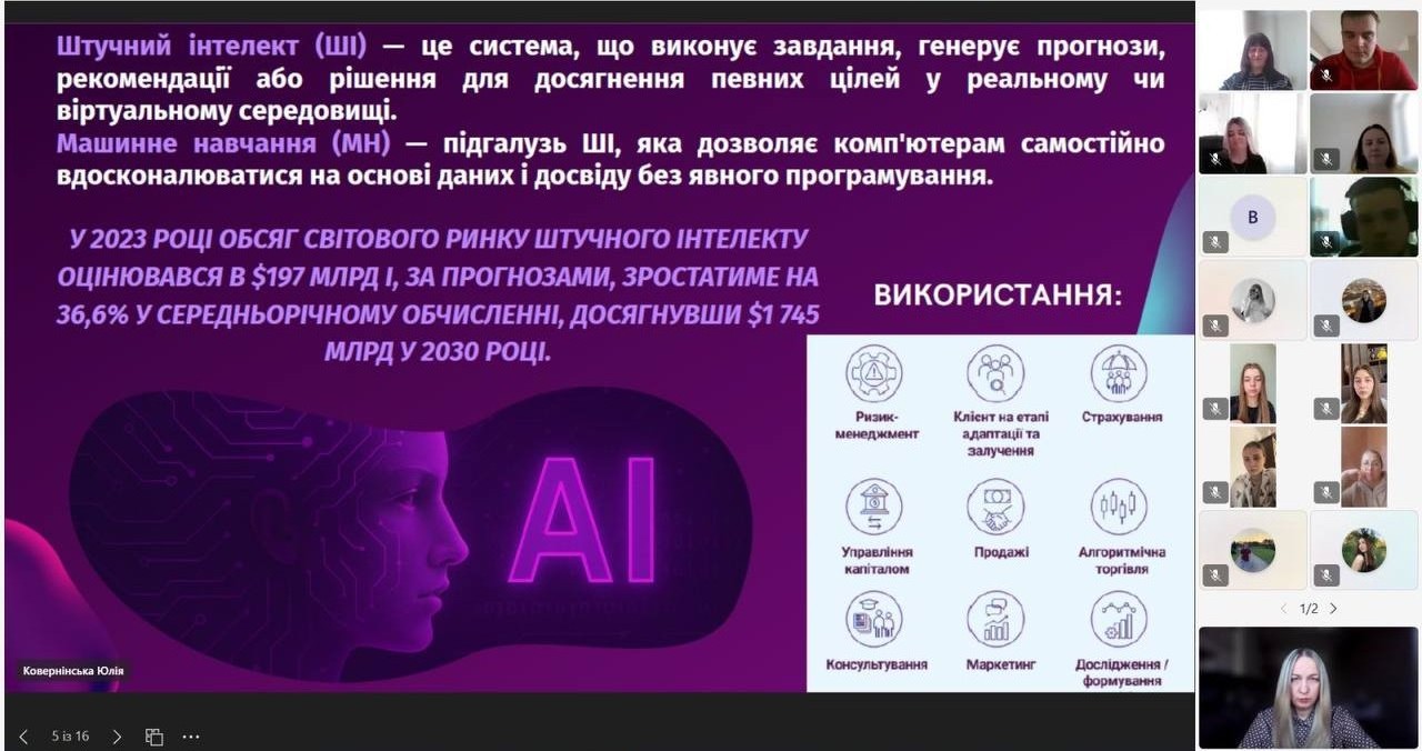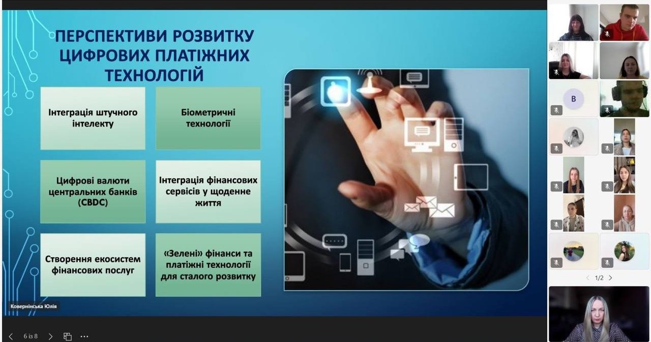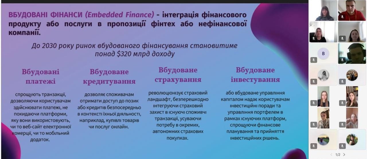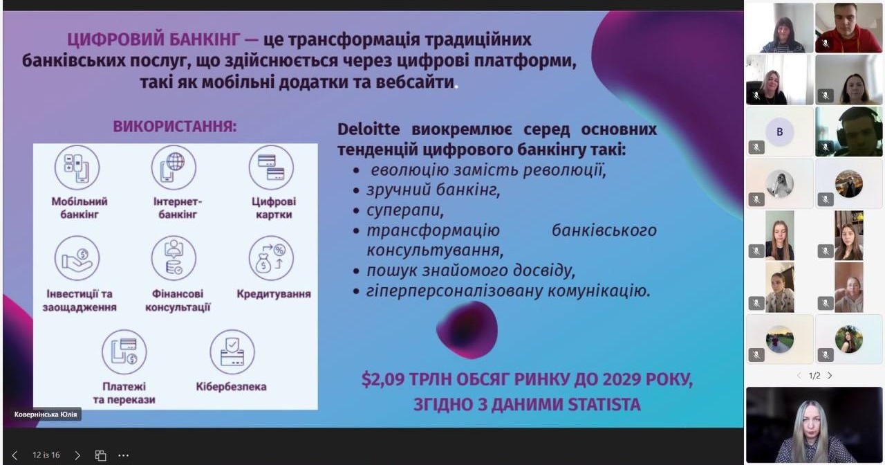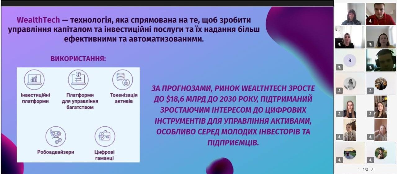 Учасниці гуртка представили свої доповіді. Тимощук Лілія, здобувачка 1 курсу другого (магістерського) рівня вищої освіти, групи 20.04, презентувала огляд ключових фінтех трендів 2025 року, таких як штучний інтелект та машинне навчання, блокчейн, агентський та відкритий банкінг, Big Data, кібербезпека, ESG, вбудовані фінанси, цифровий банкінг, WealthTech та їх вплив на фінансову систему України і світу. Кобзенко Маргарита, здобувачка 2 курсу першого (бакалаврського) рівня вищої освіти, групи 23.04, розповіла про роль цифрових платіжних технологій у розвитку фінансової системи України. Вона акцентувала увагу на їхньому впливі на безпеку, зручність і прозорість фінансових операцій, навела динаміку основних показників у цій сфері за 2022–2024 роки, а також розглянула питання кібербезпеки в платіжному середовищі та необхідність підвищення фінансової грамотності населення. Чайкун Дар’я, здобувачка 2 курсу першого (бакалаврського) рівня вищої освіти, групи 23.04, висвітлила особливості застосування фінансових технологій для модернізації податкового адміністрування та контролю через цифровізацію податкових процесів. У своїй доповіді вона зосередилася на інструментах цифровізації, що використовуються для автоматизації збору податків, обробки податкової звітності та здійснення контролю за дотриманням податкового законодавства.
