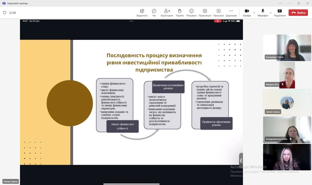 Участь у науковому обговоренні взяли провідні науковці кафедри: д.е.н., професор Бондарук Т. Г., д.е.н., к.е.н., доцент Богріновцева Л. М., к.е.н., доцент Ковернінська Ю. В., к.е.н., доцент Федина В. В.