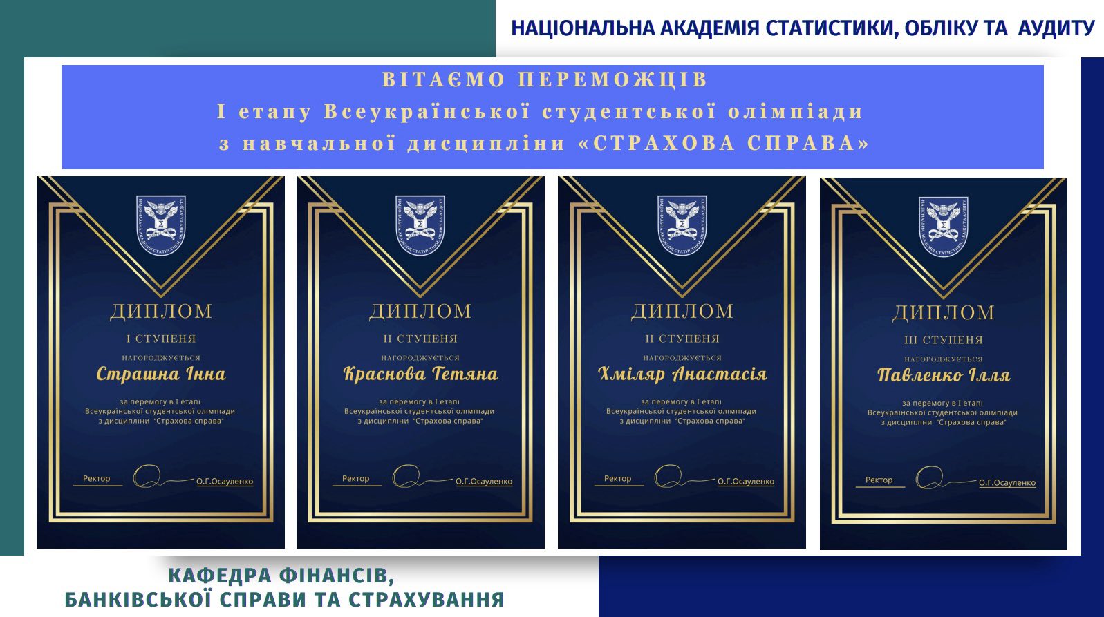 За результатами І етапу Всеукраїнської студентської олімпіади з навчальної дисципліни «Страхова справа» перемогу в олімпіаді здобули: