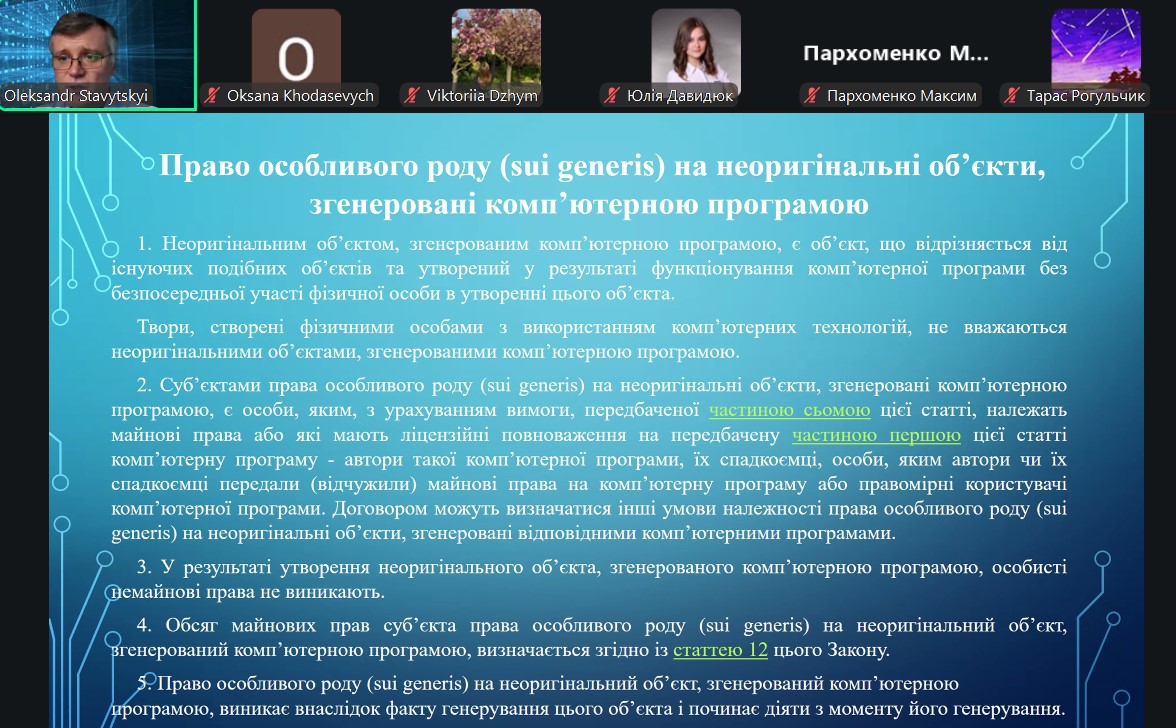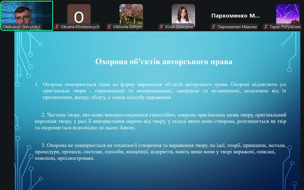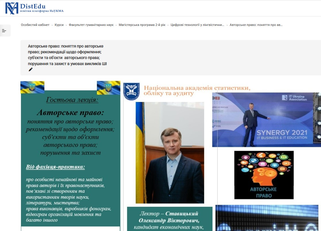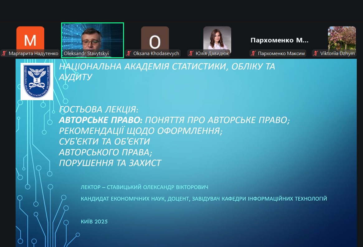 Гостьові лекції мають особливу цінність у навчальному процесі, адже дозволяють студентам побачити теоретичні знання крізь призму реального професійного досвіду. Саме таку роль відіграла лекція з авторського права, проведена завідувачем кафедри інформаційних технологій к.е.н., доц. Ставицьким Олександром Вікторовичем для магістрів Києво-Могилянської академії на запрошення к.ф.н., с.н.с. Надутенко Маргарити Володимирівни. Вона стала важливим доповненням до академічних курсів і продемонструвала, наскільки актуальною і динамічною є сфера інтелектуальної власності в сучасному цифровому світі.
