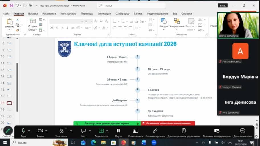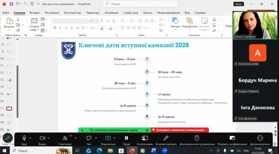 Проректор Академії, к.е.н., доцент – Горобець О.О. ознайомила присутніх зі спеціальностями НАСОА, розкрила особливості вступної кампанії у 2026 р. та поділилася лайфхаками під час НМТ та подачі заяв на вступ.