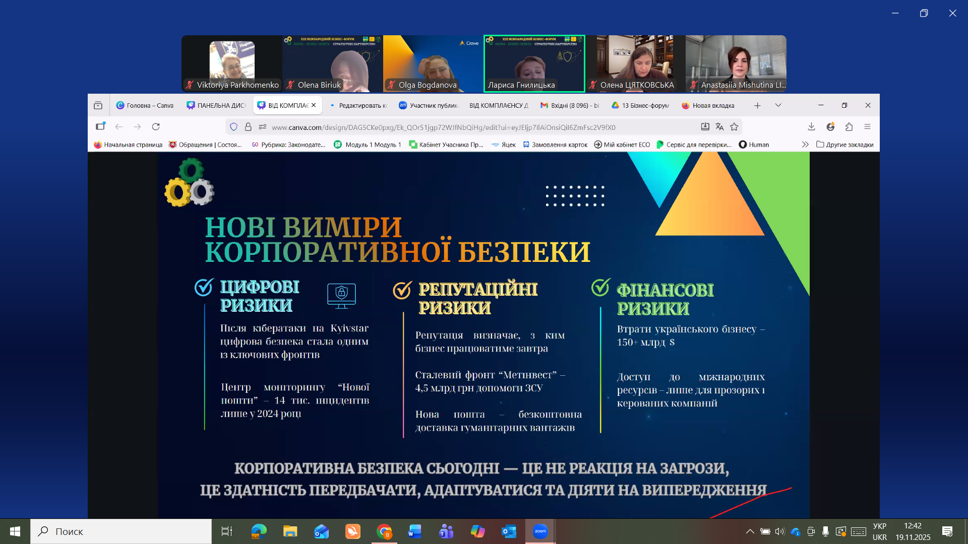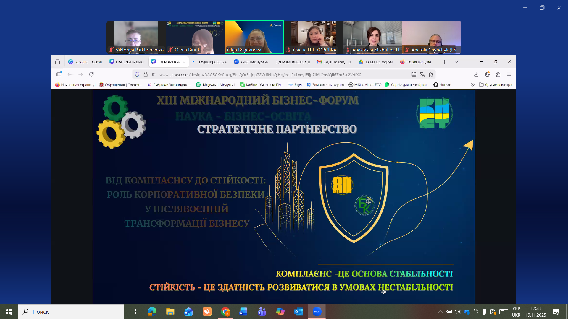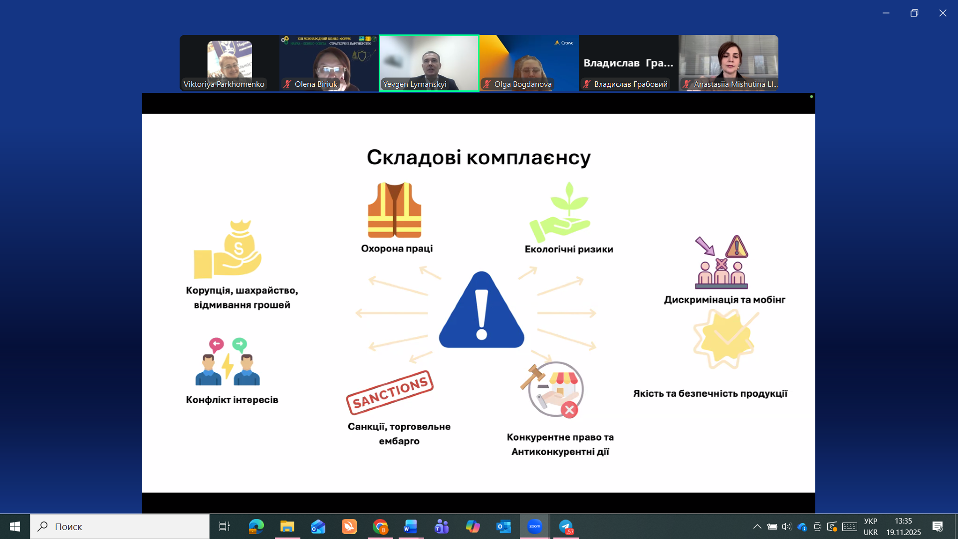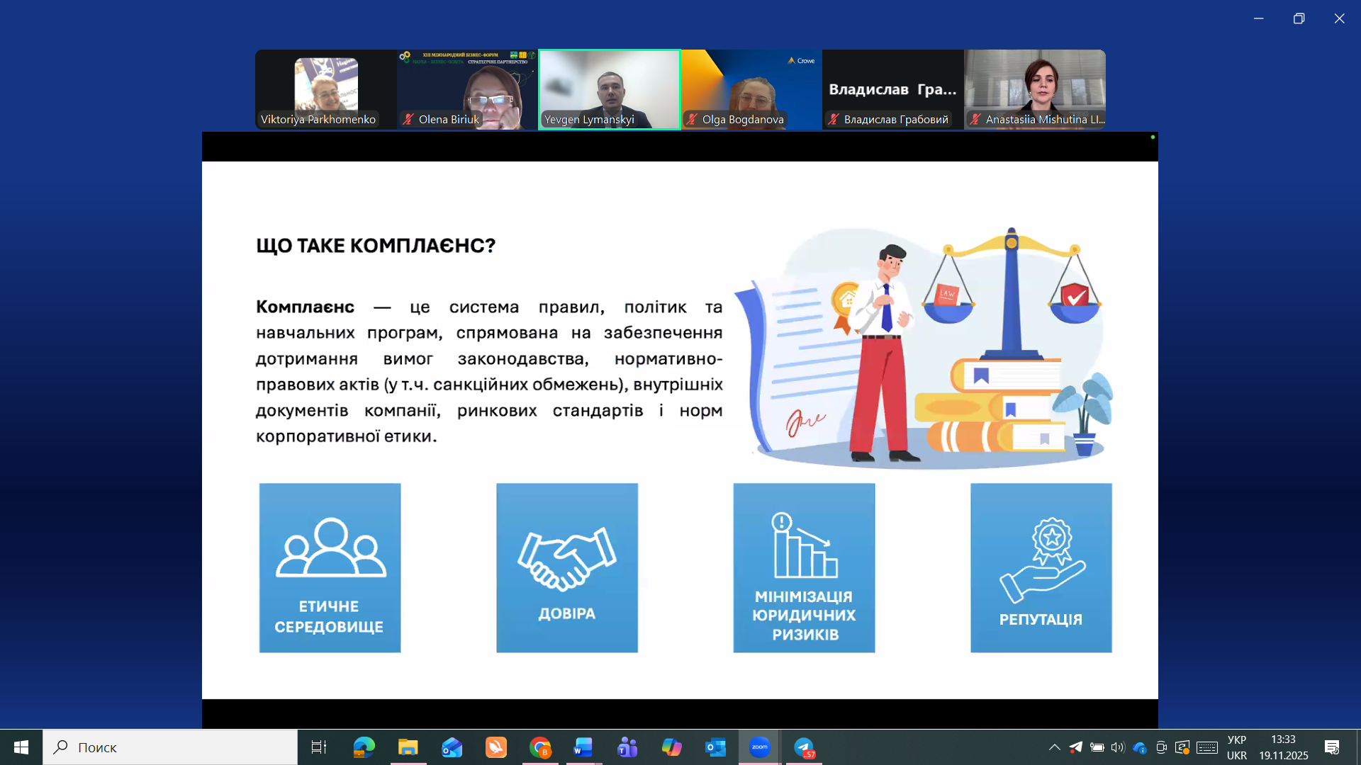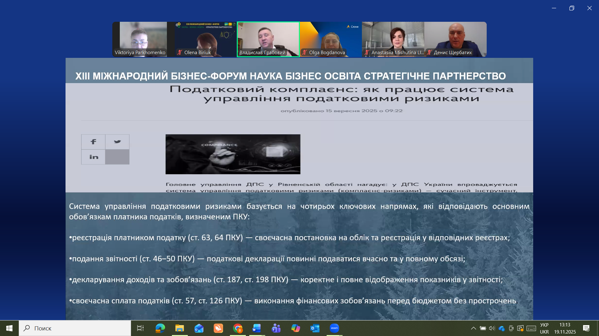 19 листопада 2025 року в межах ХІІІ Міжнародного бізнес-форуму «Наука – Бізнес – Освіта: стратегічне партнерство» студенти освітньої програми «Міжнародний менеджмент» разом із викладачем, к.е.н., доцентом кафедри менеджменту, маркетингу та публічного управління Вікторією Пархоменко, долучилися до панельної дискусії «Комплаєнс у системі безпеки держави та бізнесу».