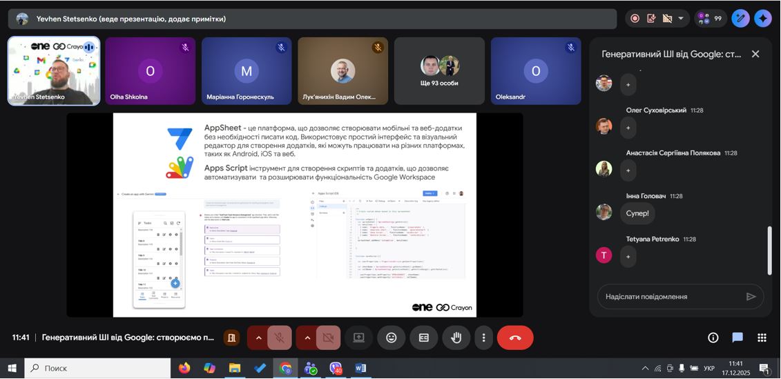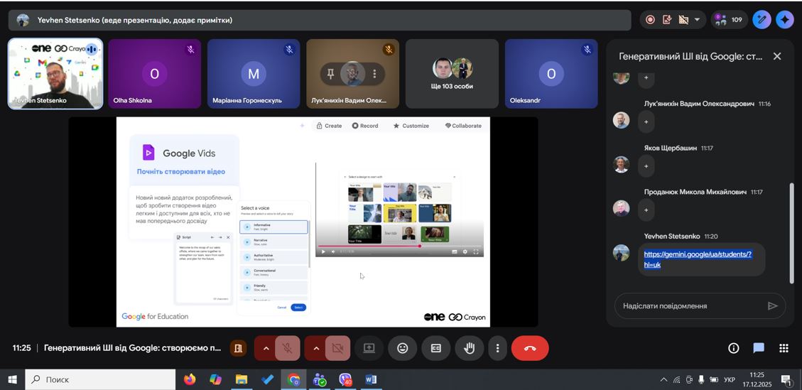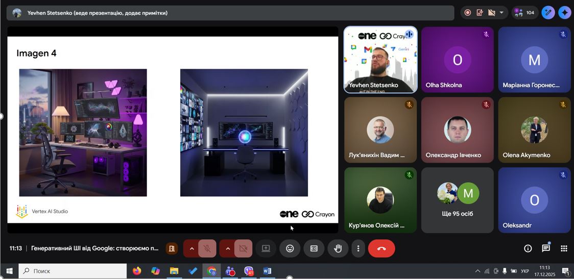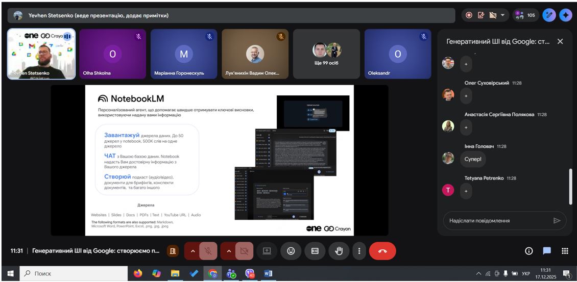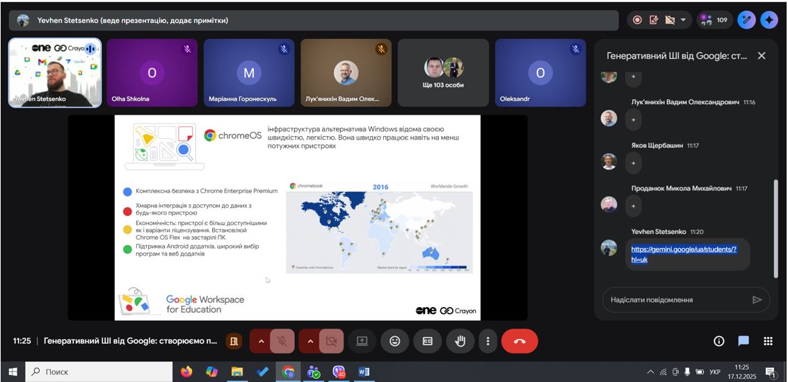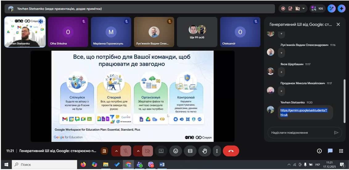 Під час вебінару було продемонстровано практичні можливості генеративного ШІ в екосистемі Google Workspace: створення текстів, презентацій, аналітики та навчальних матеріалів. Студенти побачили, як ШІ може підвищувати продуктивність, автоматизувати рутинні завдання та підтримувати командну роботу.