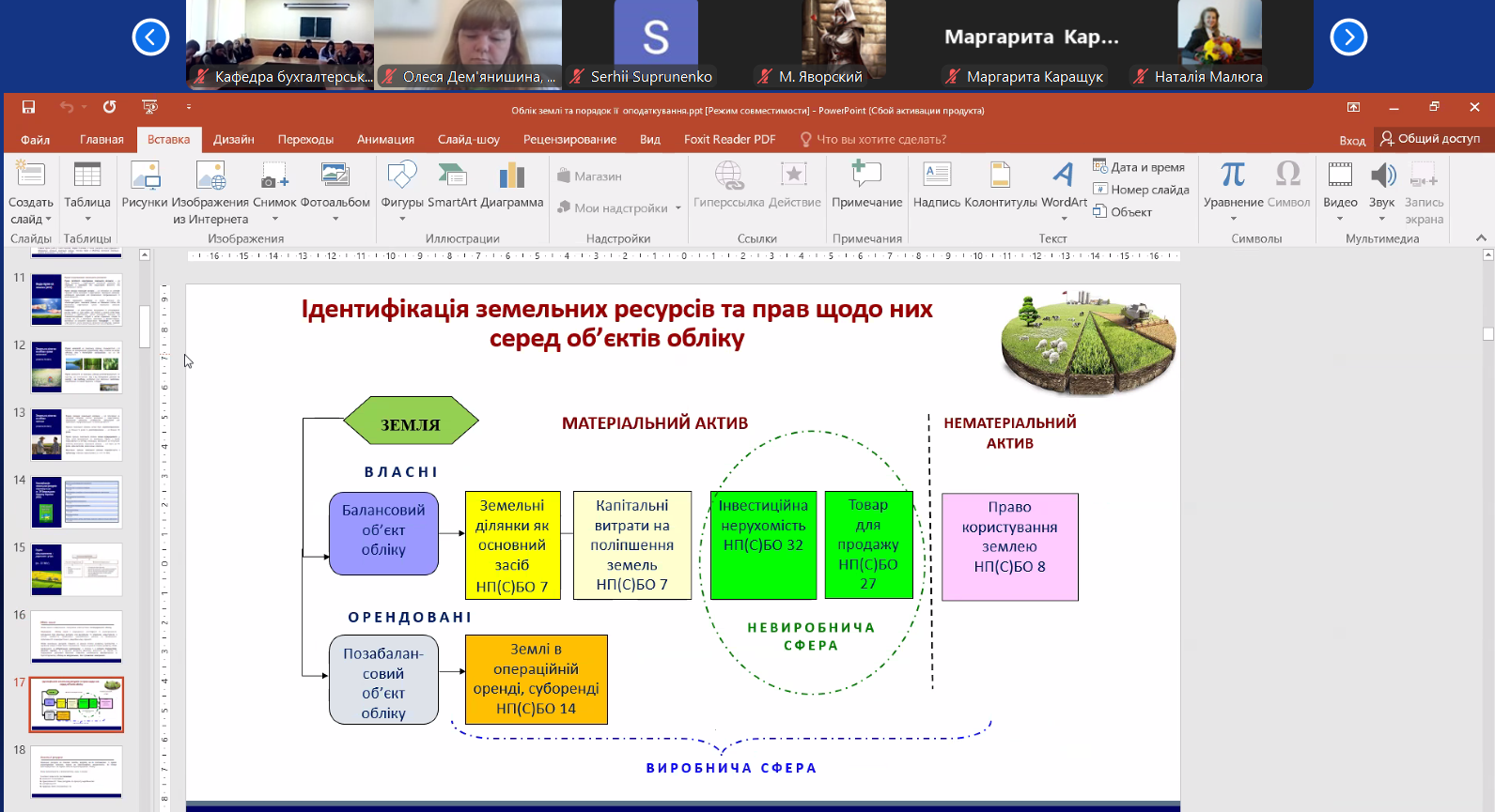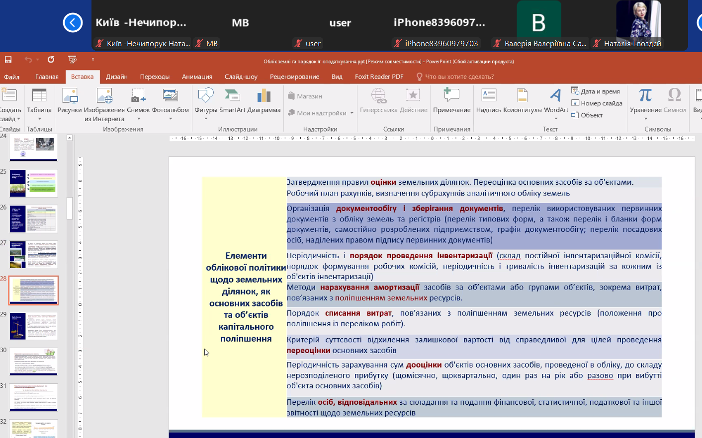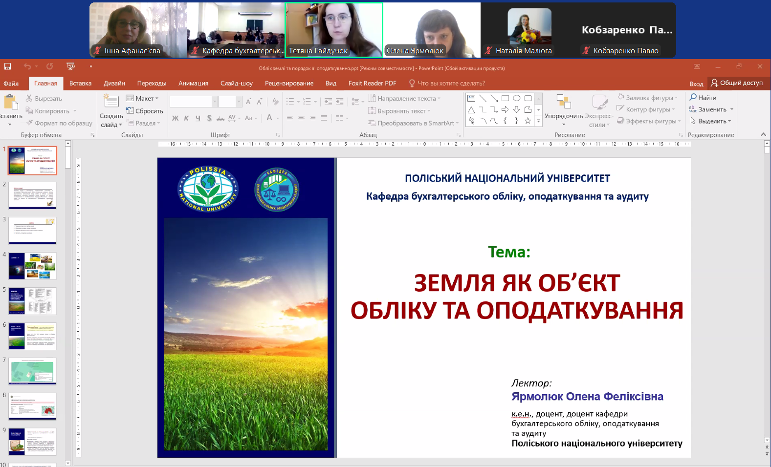 28.04.2025 р. у рамках партнерства з Поліським національним університетом науково-педагогічні працівники кафедри обліку, аудиту та оподаткування НАСОА та здобувачі вищої освіти спеціальності D1 «Облік і оподаткування» прослухали гостьову лекцію к.е.н., доцента Ярмолюк О. на тему «Земля як об’єкт обліку та оподаткування» в межах освітніх компонент «Фінансовий облік», «Облік і звітність в оподаткуванні» та «Планування та оптимізація податкових розрахунків». Під час проведення лекції здобувачі вищої освіти ознайомилися з особливостями обліку та амортизації капітальних витрат на поліпшення земель, оподаткування земельної ділянки для фізичних та юридичних осіб тощо.