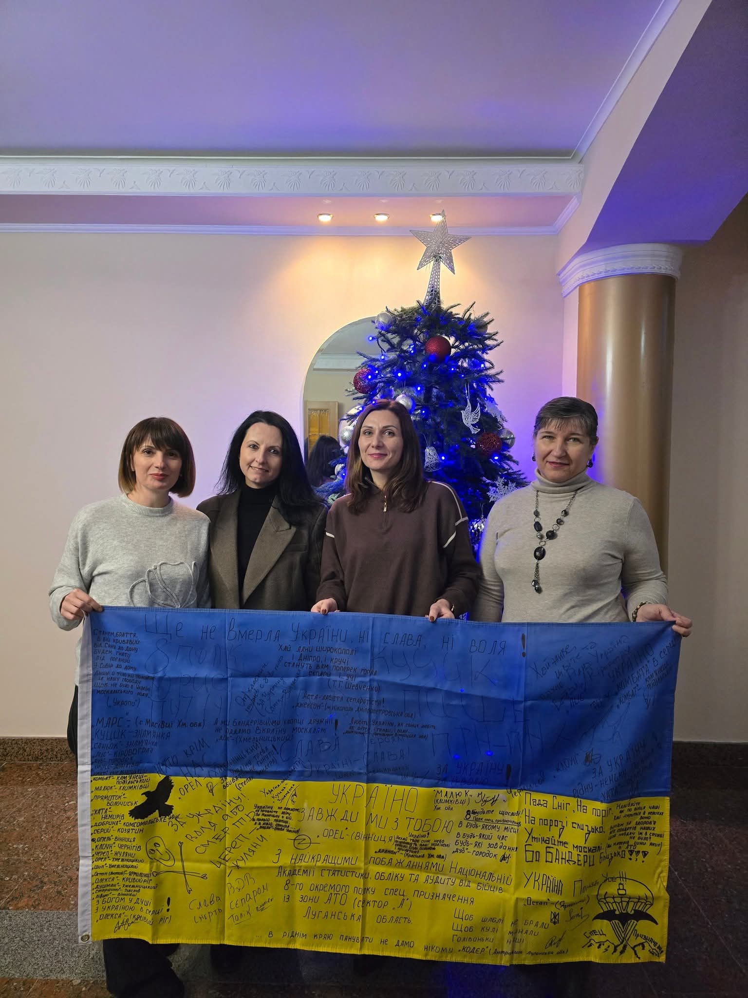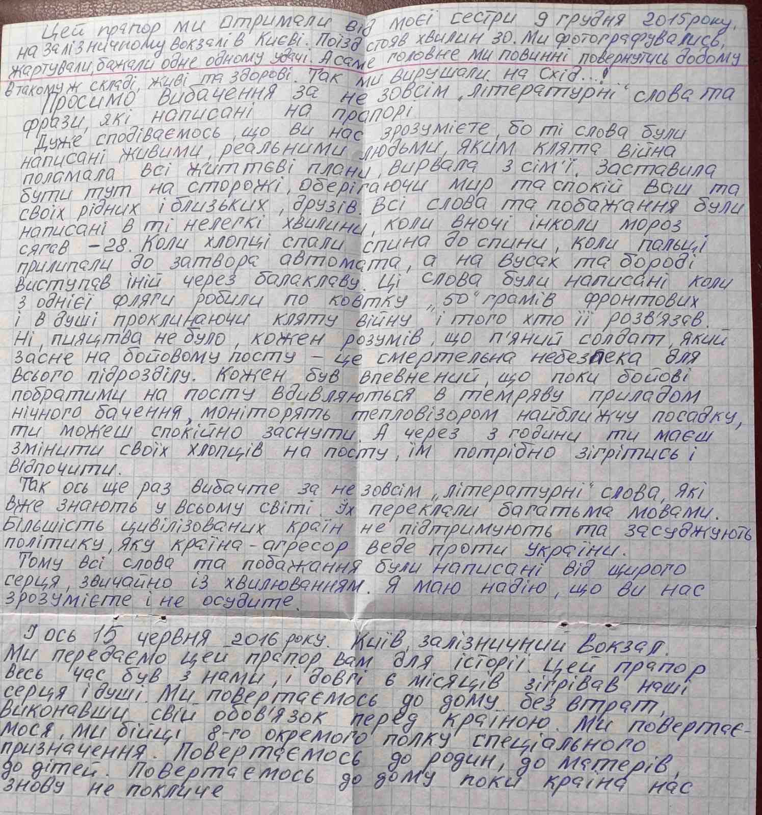 Прапору на фото з підписами наших Захисників – 10 років. До Прапора Захисники додали лист.