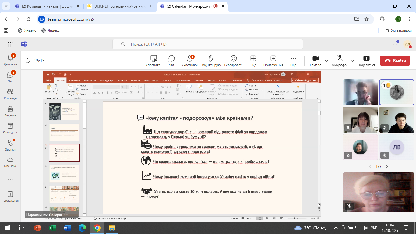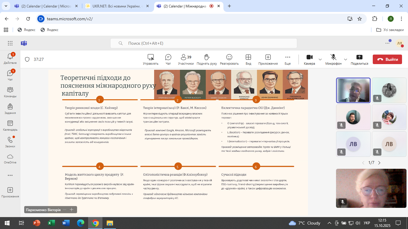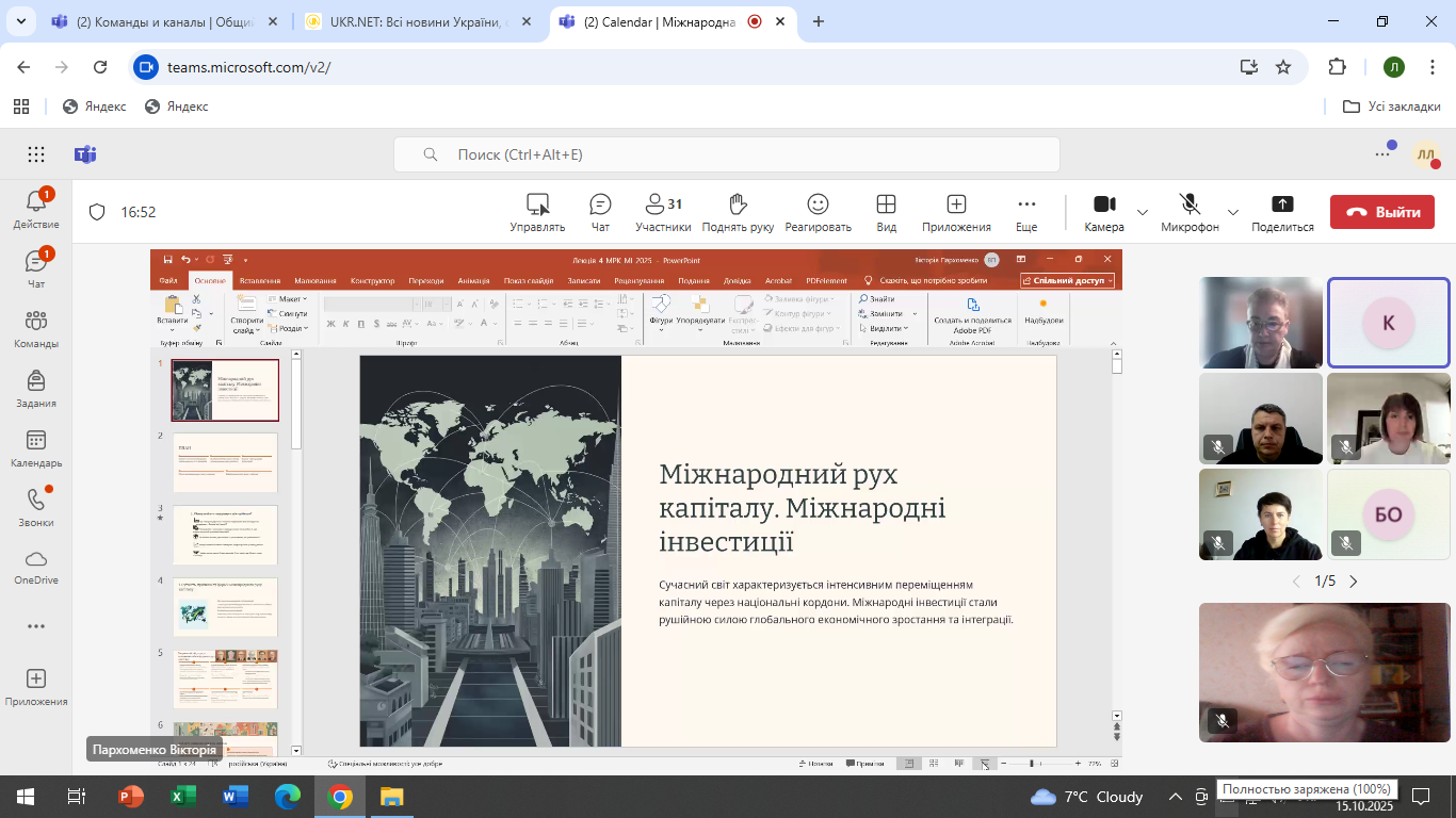 15 жовтня 2025 року об 11:40 відбулась відкрита лекція на тему: «Міжнародний рух капіталу», яка проводилась кандидатом економічних наук доцентом, доцентом кафедри менеджменту, маркетингу та публічного управління Пархоменко Вікторією Вікторівною. У лекції взяли участь студенти та викладачі кафедри, зокрема завідувач кафедри Лазоренко Л.В., доценти кафедри: Гринчак Н.А., Мотузка О.М., Ліпський Ю.В., Вакуленко В.М., ст. викл. Гаврисевич А.С. та інші.
