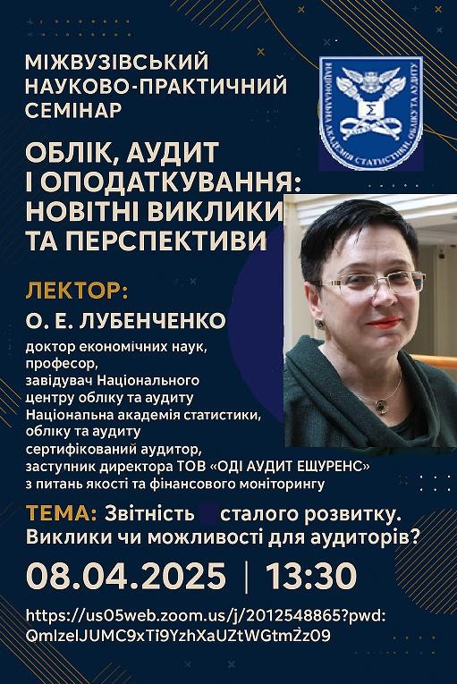 Ольга ЛУБЕНЧЕНКО, д.е.н., професор кафедри обліку, аудиту та оподаткування, завідувач Національного центру НАСОА, сертифікований аудитор, провела лекцію на актуальну тему «Звітність сталого розвитку. Виклики чи можливості для аудиторів?», яка викликала значний інтерес науковців та практиків. Міжвузівський науково-практичний семінар прийшов у атмосфері обміну досвідом, настанов і мотивації до проведення наукових досліджень та реалізації їх результатів. Щиро дякуємо завідувачу кафедри обліку та оподаткування Прикарпатського національного університету імені Василя Стефаника д.е.н., професору Івану БАЛАНЮКУ та модератору семінару Марії ВАСИЛЮК, д.е.н, професору, за організацію заходу та плідну співпрацю з кафедрою обліку, аудиту та оподаткування НАСОА!