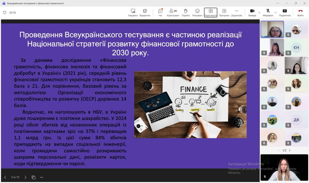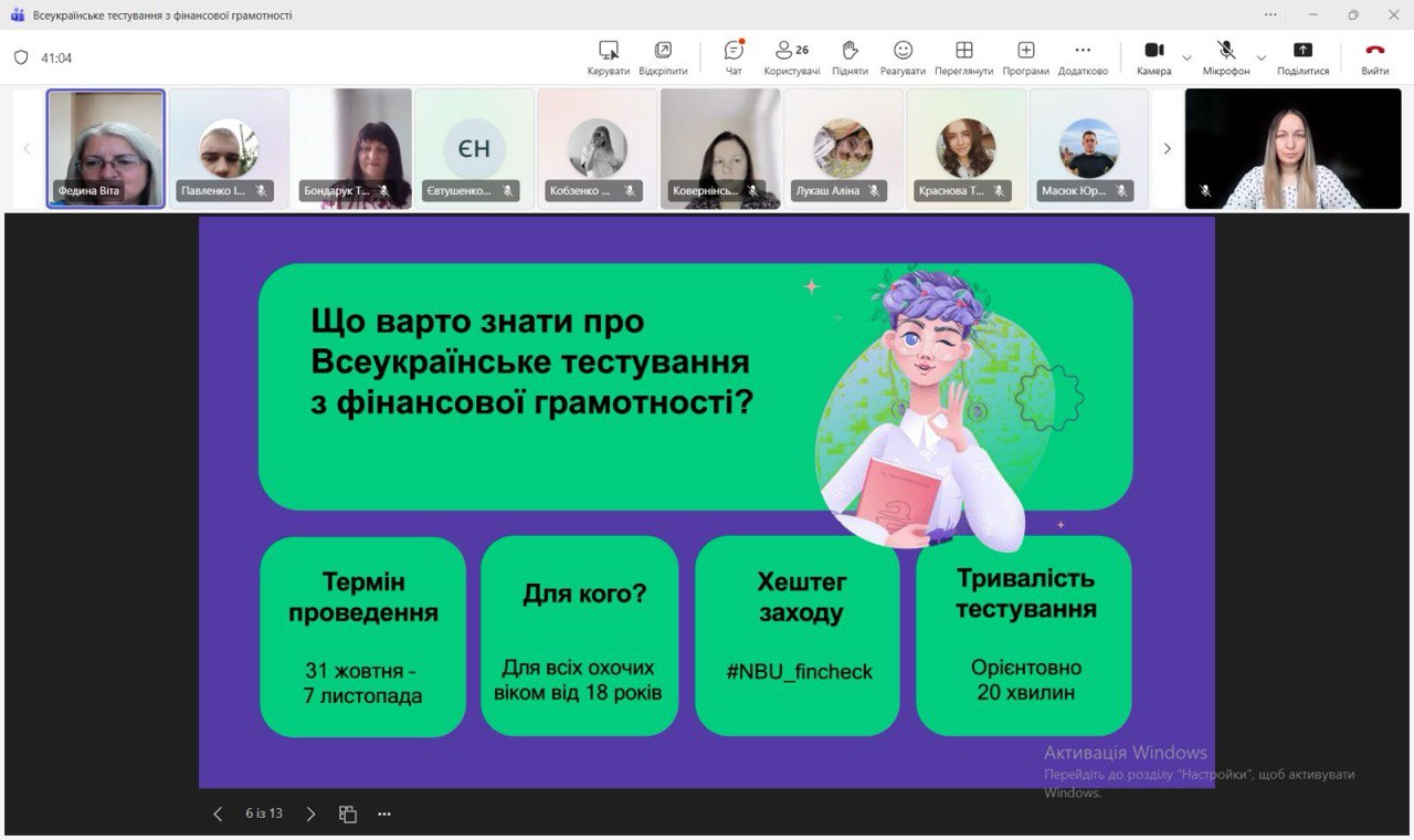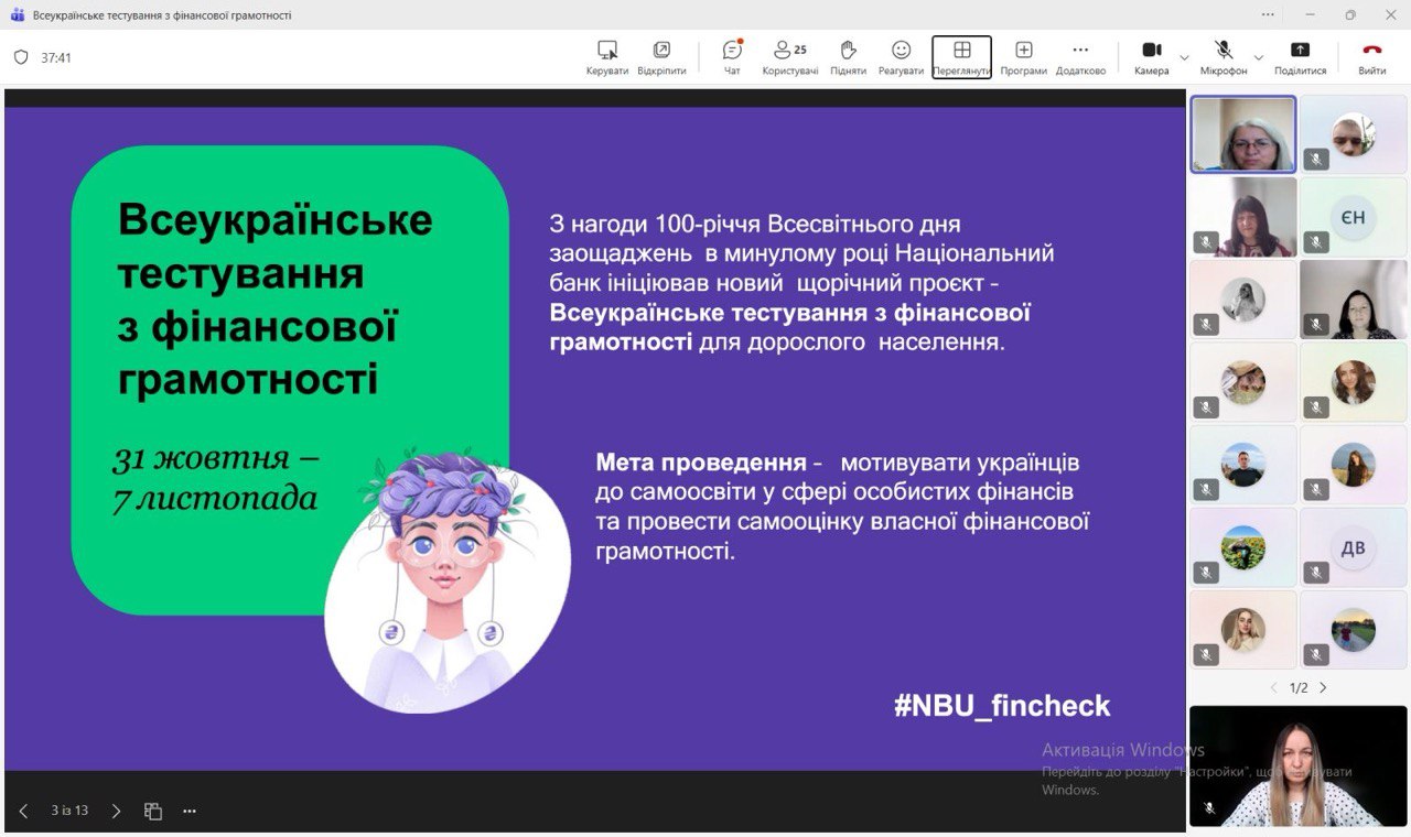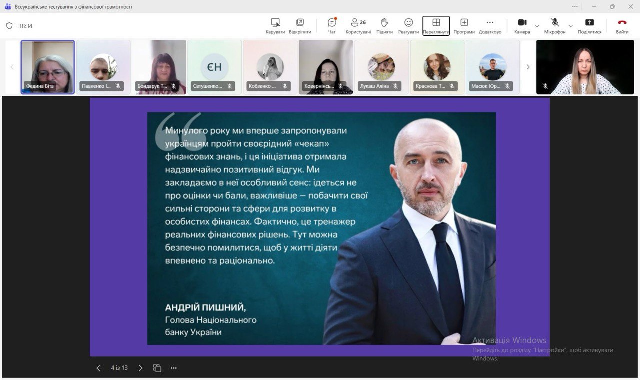 За ініціативи кафедри фінансів, банківської справи та страхування НАСОА здобувачі вищої освіти, викладачі та працівники Академії долучилися до Всеукраїнського тестування з фінансової грамотності, організованого Національним банком України. Мета участі – не лише перевірити власні знання, а й підтримати ідею поширення фінансової обізнаності серед широкого кола громадян. Адже розвиток фінансової культури є важливою передумовою сталого економічного зростання та формування відповідального суспільства.