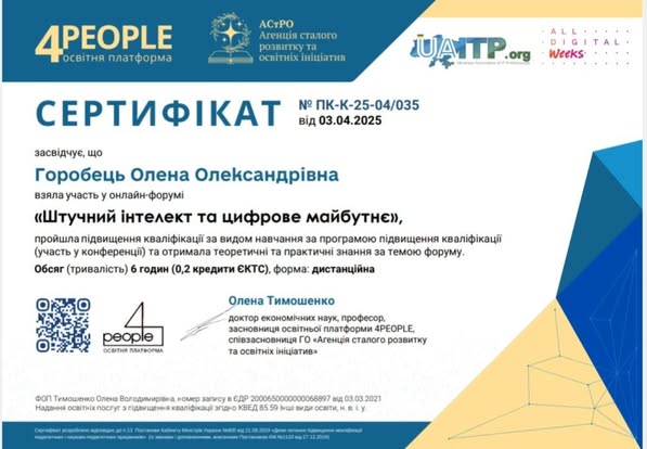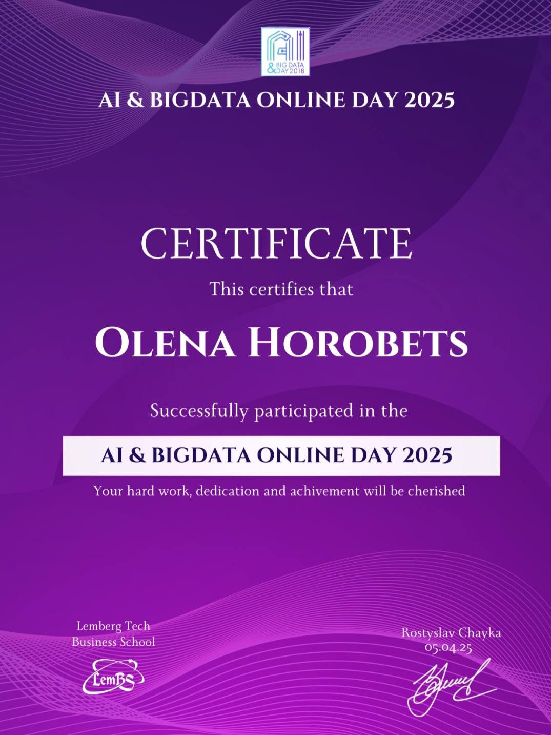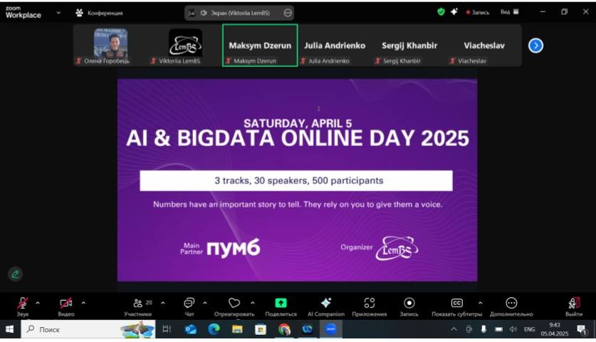 5 квітня Горобець О.О., в рамках підвищення кваліфікації, відвідала масштабний захід – онлайн-конференцію AI & BigData Online Day 2025.