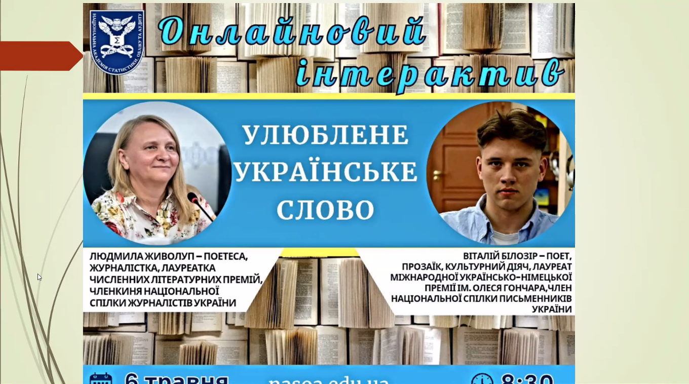 6 травня 2025 року на кафедрі іноземних мов Національної академії статистики, обліку та аудиту відбулася онлайнова творча зустріч із сучасними українськими поетами — Людмилою Живолуп та Віталієм Білозором. Захід став важливою культурною подією, що об’єднала викладачів, студентів та всіх поціновувачів художнього слова.