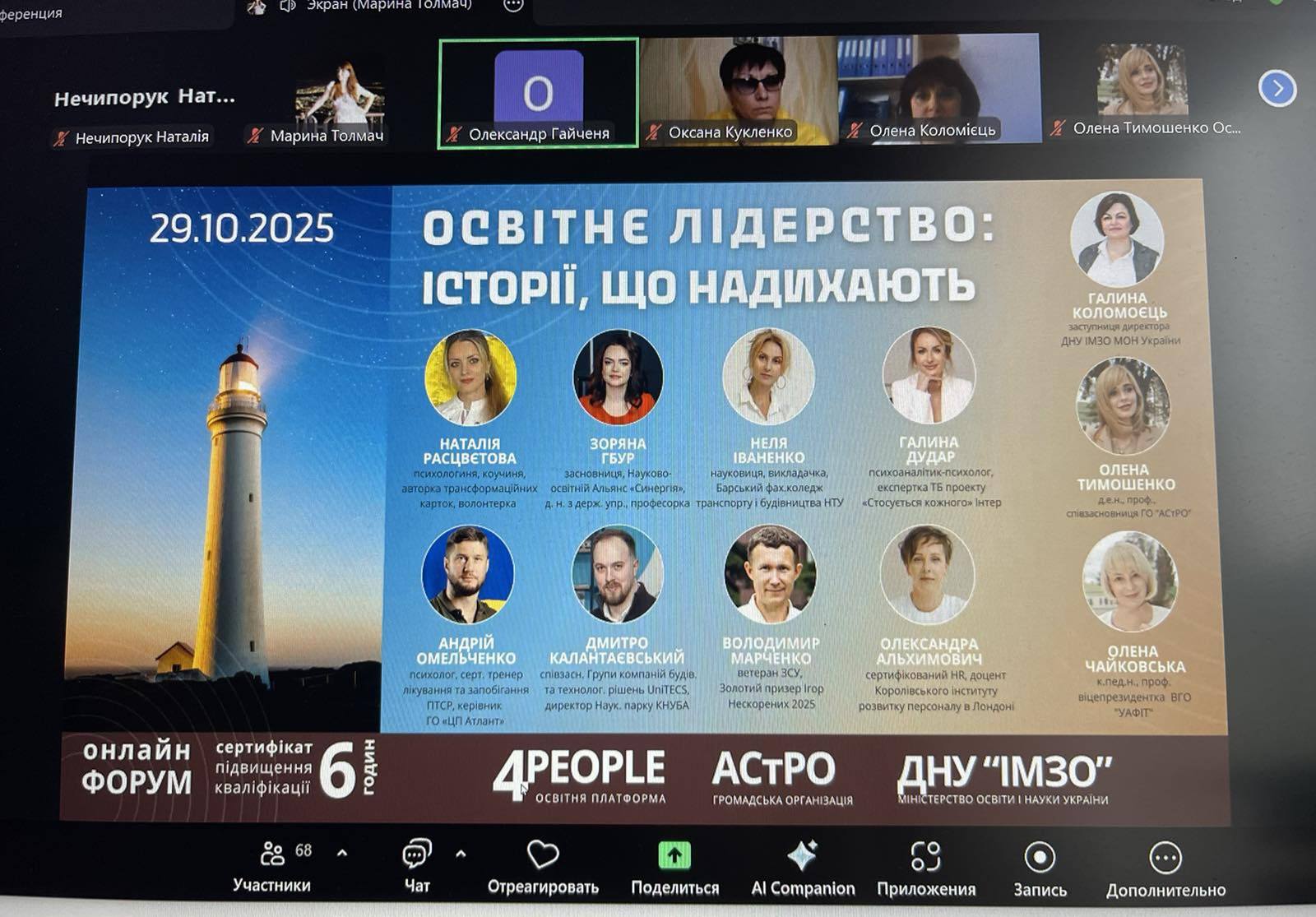 Представники Національної академії статистики, обліку та аудиту у складі декана обліково-статистичного факультету, д.е.н., доцента- Пилипенка О.І., декана фінансово-економічного факультету, к.е.н., доцента – Євтушенко Н.М., завідувача кафедри статистики та математичних методів в економіці, к.е.н., доцента – Горобець О.О., к.філол.н., доцента, доцента кафедри іноземних мов – Діденко Н.М., к.е.н., доцента, доцента кафедри обліку, аудиту та оподаткування – Нечипорук Н.В., к.е.н., доцента, доцента кафедри менеджменту, маркетингу та публічного управління – Гринчак Н.А. взяли участь у Всеукраїнському онлайн-форумі “Освітнє лідерство: історії, що надихають”, який відбувся 29 жовтня.