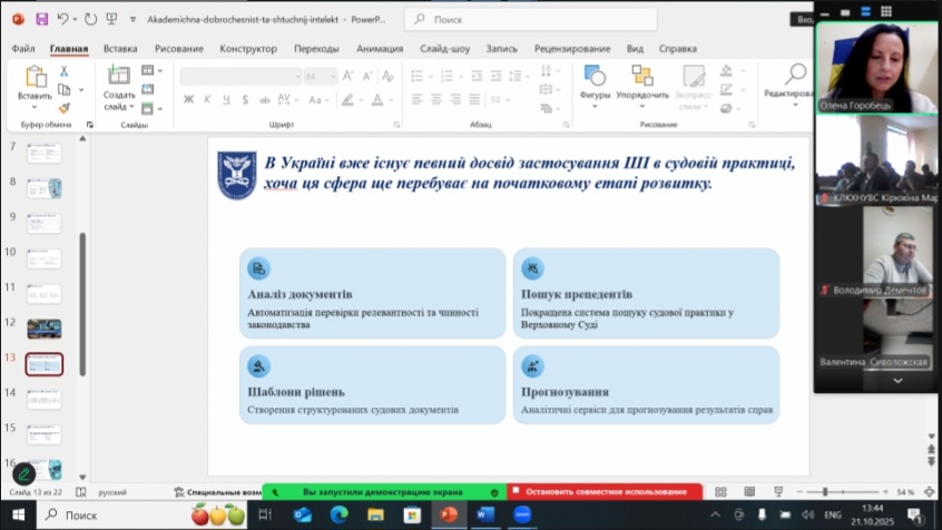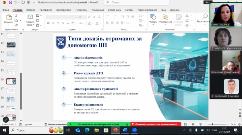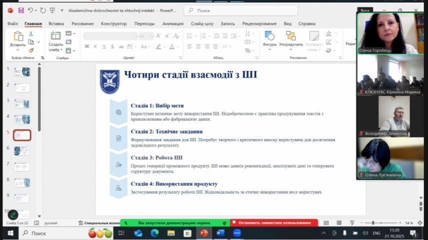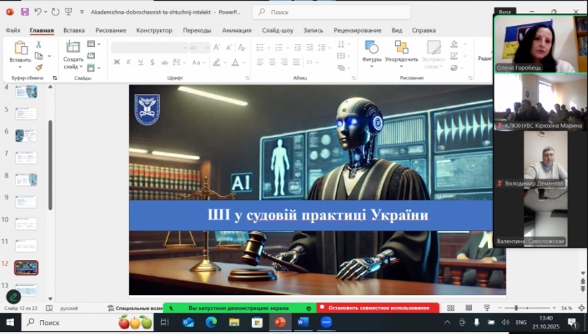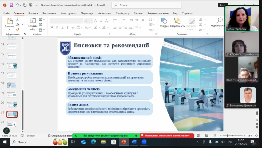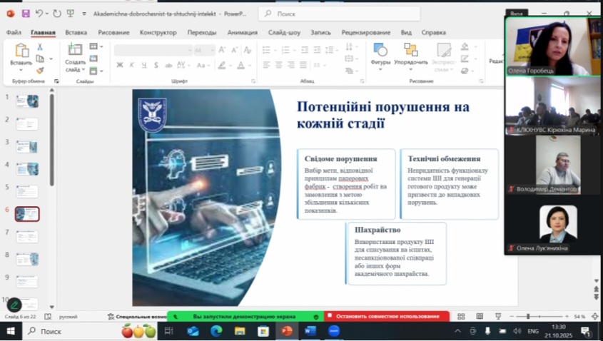 У своїй доповіді Олена Горобець представила комплексний огляд викликів і можливостей штучного інтелекту крізь призму академічної доброчесності — від правових та етичних аспектів його застосування в освіті й науці до питань захисту персональних даних і відповідальності користувача.