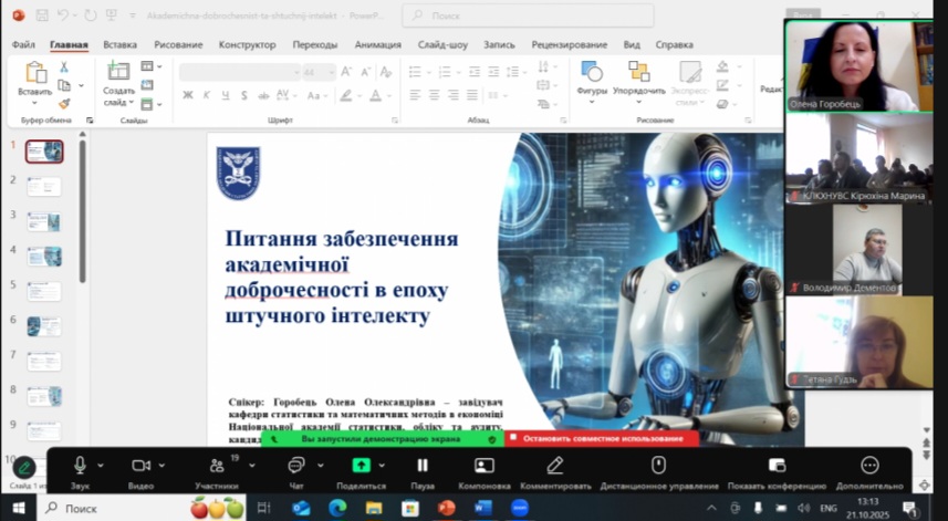 21 жовтня завідувач кафедри статистики та математичних методів в економіці Національної академії статистики, обліку та аудиту, к.е.н., доцент – Олена Олександрівна Горобець була запрошена спікеркою до Харківського національного університету внутрішніх справ (ХНУВС) із лекцією на тему «Питання забезпечення академічної доброчесності в епоху штучного інтелекту».