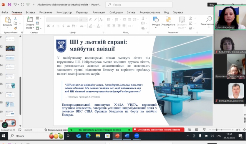 Спікерка окреслила потенційні ризики недоброчесності, надала практичні рекомендації щодо прозорого використання ШІ у навчальному процесі та наголосила на необхідності формування етичних стандартів взаємодії з новими технологіями, які вже змінюють освітній і професійний простір.