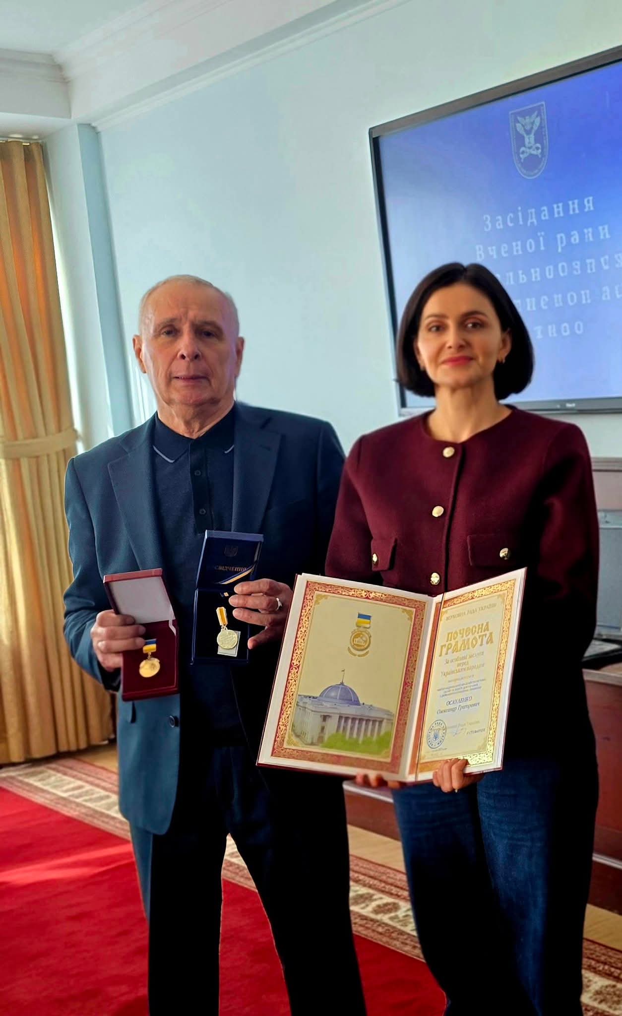 Почесну грамоту Верховної Ради України «За особливі заслуги перед українським народом» Олександру Григоровичу вручила Ольга Василевська-Смаглюк — народний депутат України, заступниця голови Комітету Верховної Ради України з питань фінансів, податкової та митної політики.