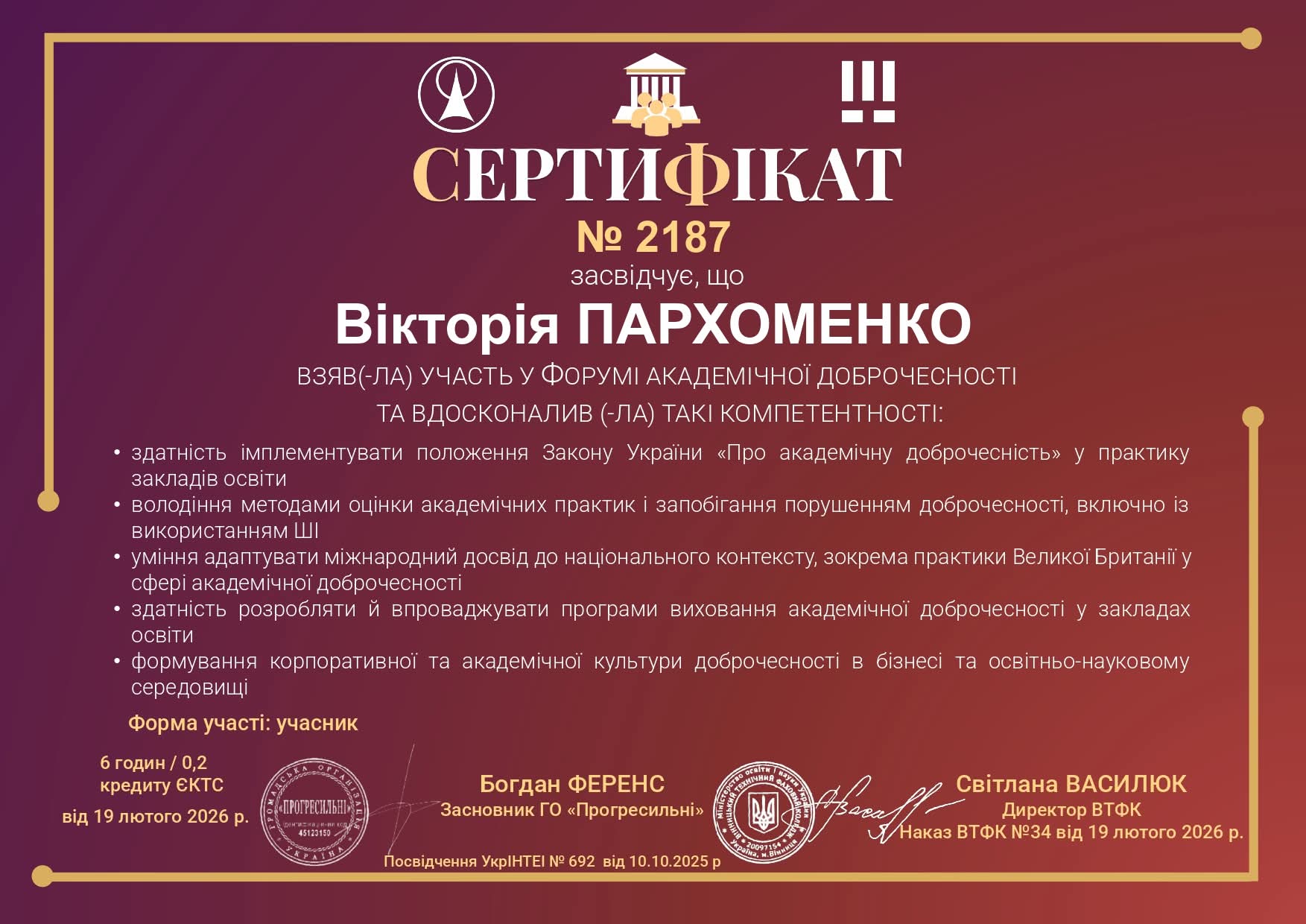 Об’єднуватися задля розвитку культури доброчесності надзвичайно важливо! 19 лютого 2026 року к.е.н., доцент кафедри менеджменту та маркетингу Вікторія Пархоменко взяла участь у Форумі «Визначення ефективних підходів для забезпечення академічної доброчесності в освітній діяльності за сучасних умов», що відбувся на базі Вінницького технічного фахового коледжу за підтримки ГО Прогресильні. Форум став професійною платформою для обговорення механізмів імплементації Закону України «Про академічну доброчесність», аналізу