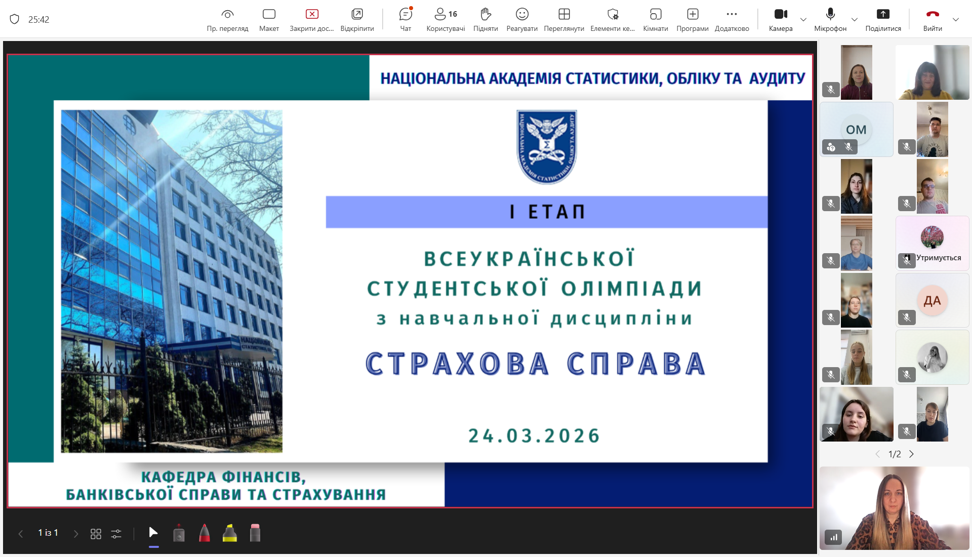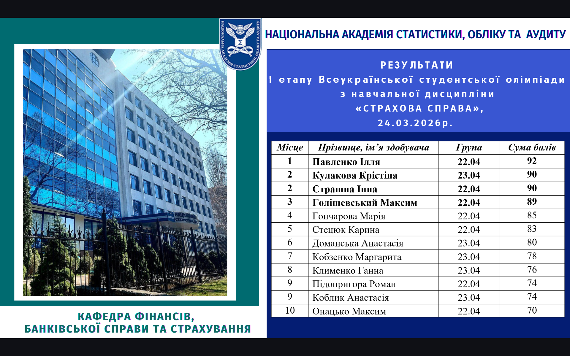 24 березня 2026 року кафедрою фінансів, банківської справи та страхування Національної академії статистики, обліку та аудиту було організовано та проведено І етап Всеукраїнської студентської олімпіади з навчальної дисципліни «Страхова справа».