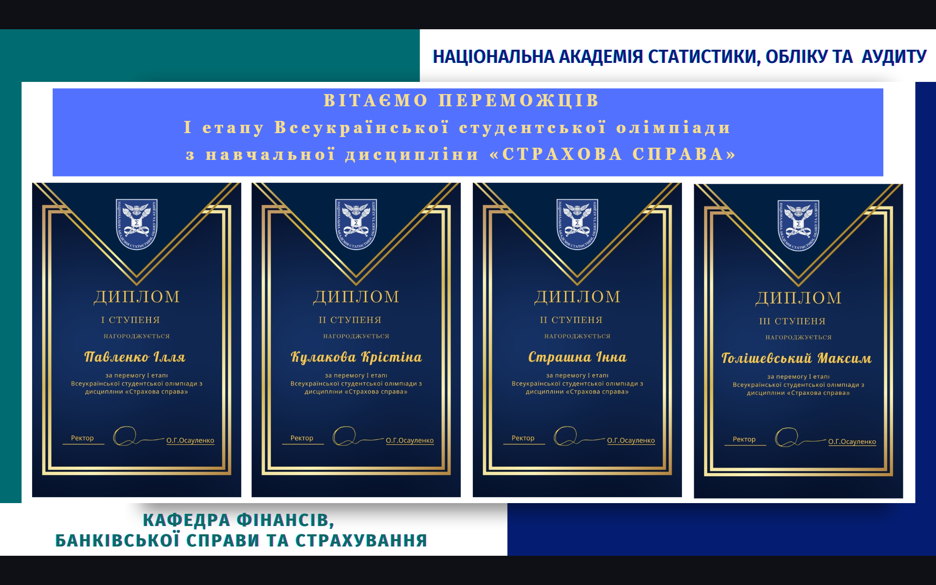 За результатами І етапу Всеукраїнської студентської олімпіади з навчальної дисципліни «Страхова справа» перемогу в олімпіаді здобули: