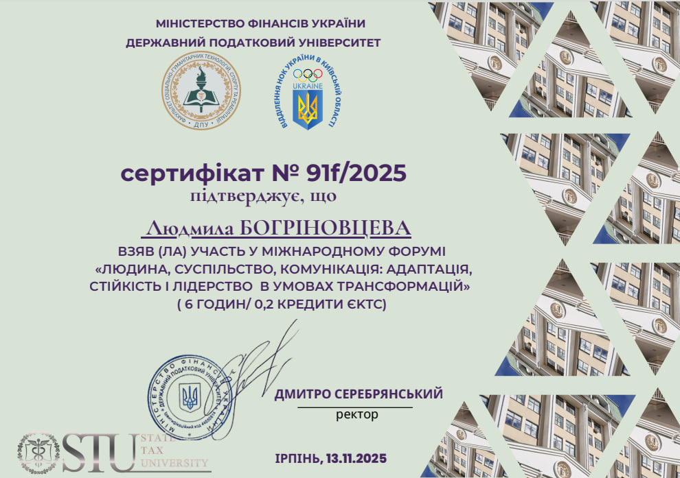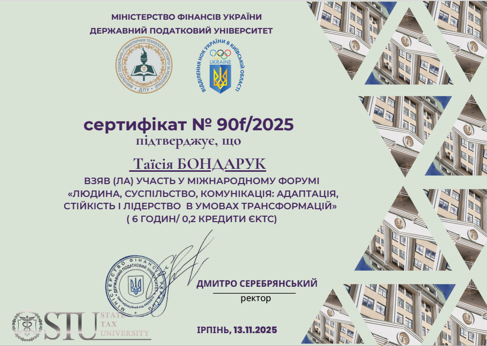 13 листопада 2025 року, в межах договору про співпрацю між Національною академією статистики, обліку та аудиту та Державним податковим університетом, д.е.н., професор, завідувач кафедри фінансів, банківської справи та страхування Таїсія Бондарук та к.е.н., доцент, доцент кафедри фінансів, банківської справи та страхування Людмила Богріновцева взяли участь у Міжнародному форумі «Людина, суспільство, комунікація: адаптація, стійкість і лідерство в умовах трансформації», який відбувся на базі Державного податкового університету (м. Ірпінь).