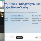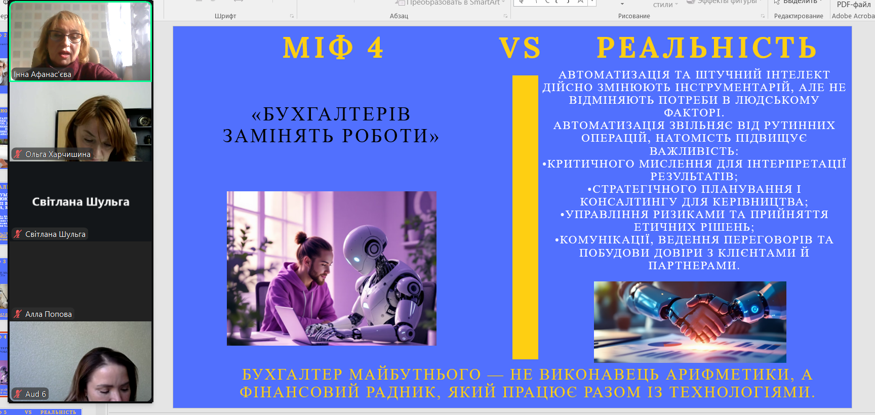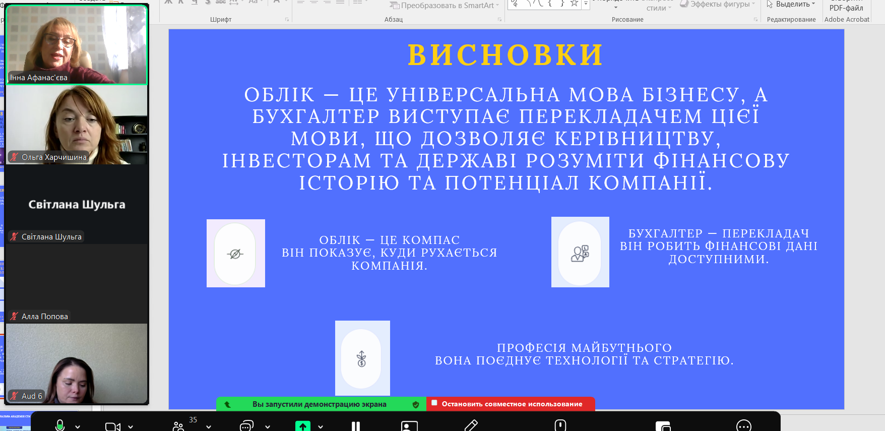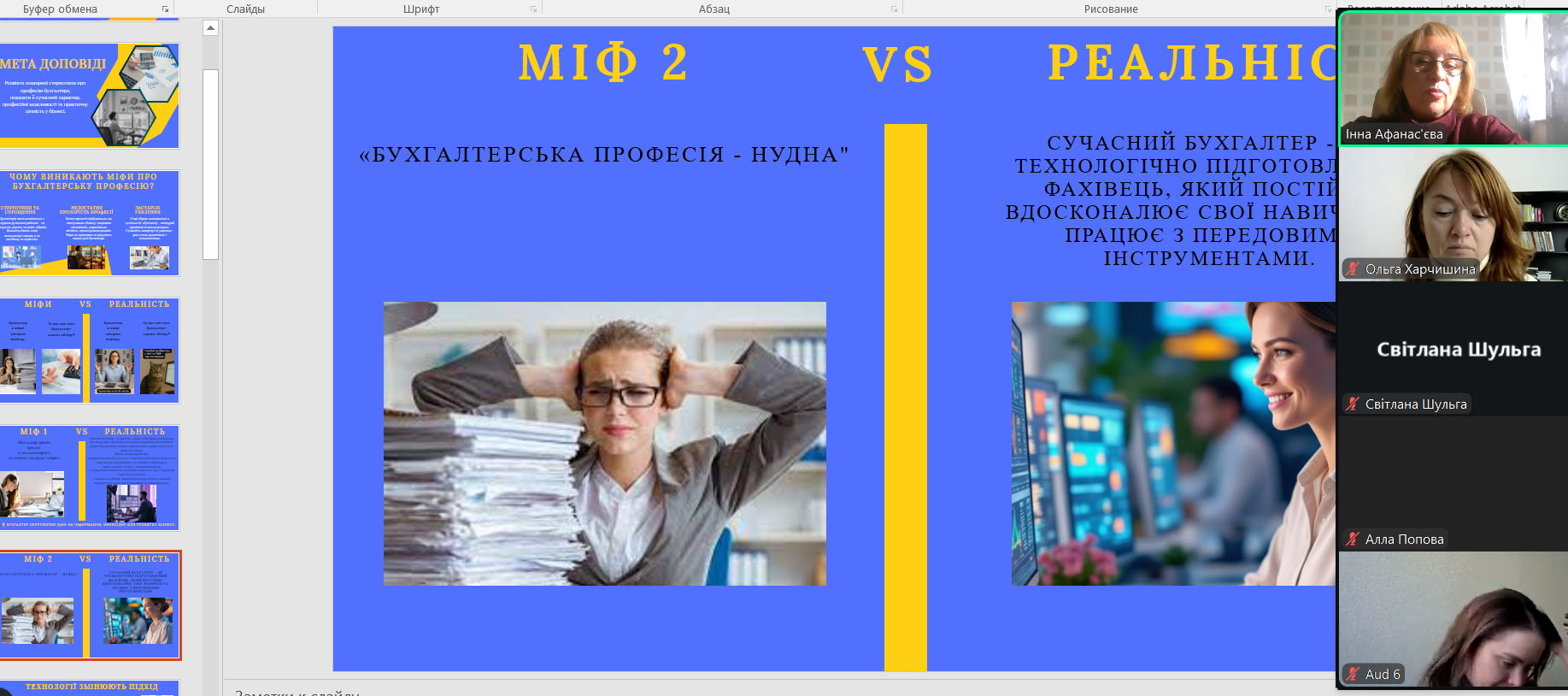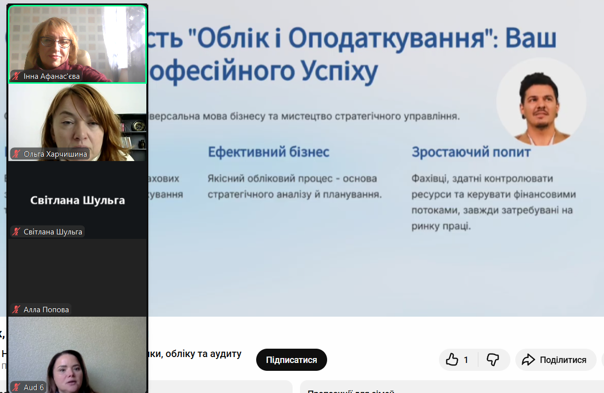 Завідувачка кафедри виступила з презентацією на актуальну тему «Облік, аудит і оподаткування: розвіювання міфів і реальні перспективи». Питання, що обговорювалися: нові виклики професії, можливості працевлаштування та кар’єрного зростання в сучасних умовах, інноваційні підходи в навчальному процесі здобувачів вищої освіти за спеціальністю D1 «Облік та оподаткування».