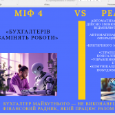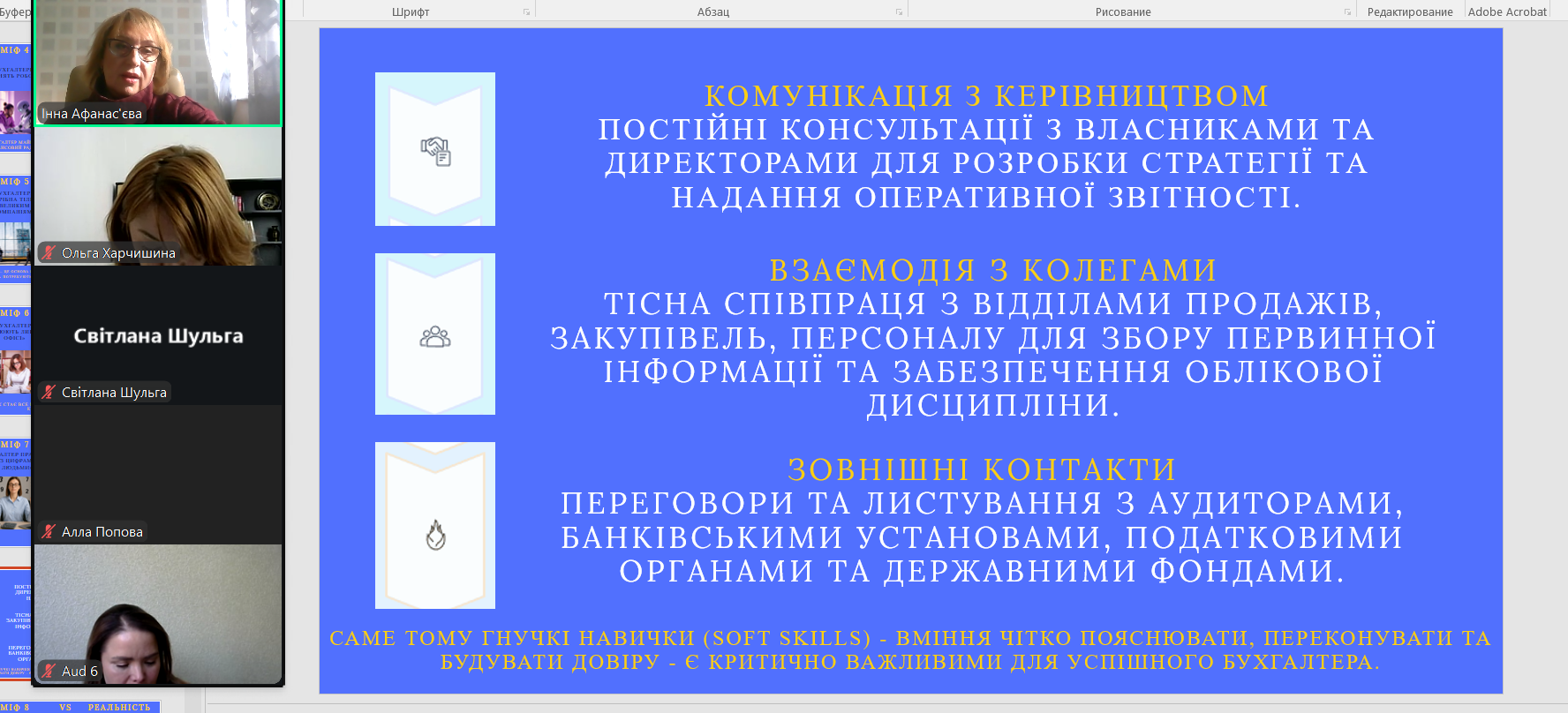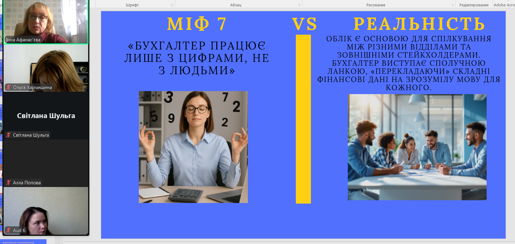 Лекторка розвіяла стереотипи про професію бухгалтера, продемонструвала її сучасний характер та особливості, професійні можливості та практичну цінність у бізнесі; охарактеризувала сучасну роль обліковця як аналітика, помічника керівника, творчої та прогресивної особи, фінансового радника, який працює разом із технологіями. Спеціальність формує високий рівень фінансової грамотності та навчає мислити логічно, приймати точні рішення, а облік стає все більш мобільним та орієнтованим на консалтинг і аутсортинг.