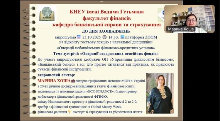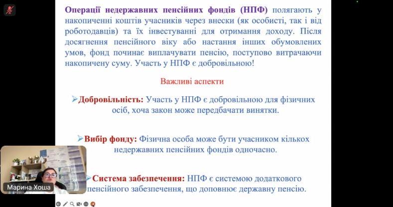 Під час лекції учасники отримали корисну інформацію про діяльність недержавних пенсійних фондів, принципи управління їх активами, а також дізналися, як сучасні фінансові інструменти допомагають формувати особисті заощадження та підвищувати рівень фінансової грамотності населення.