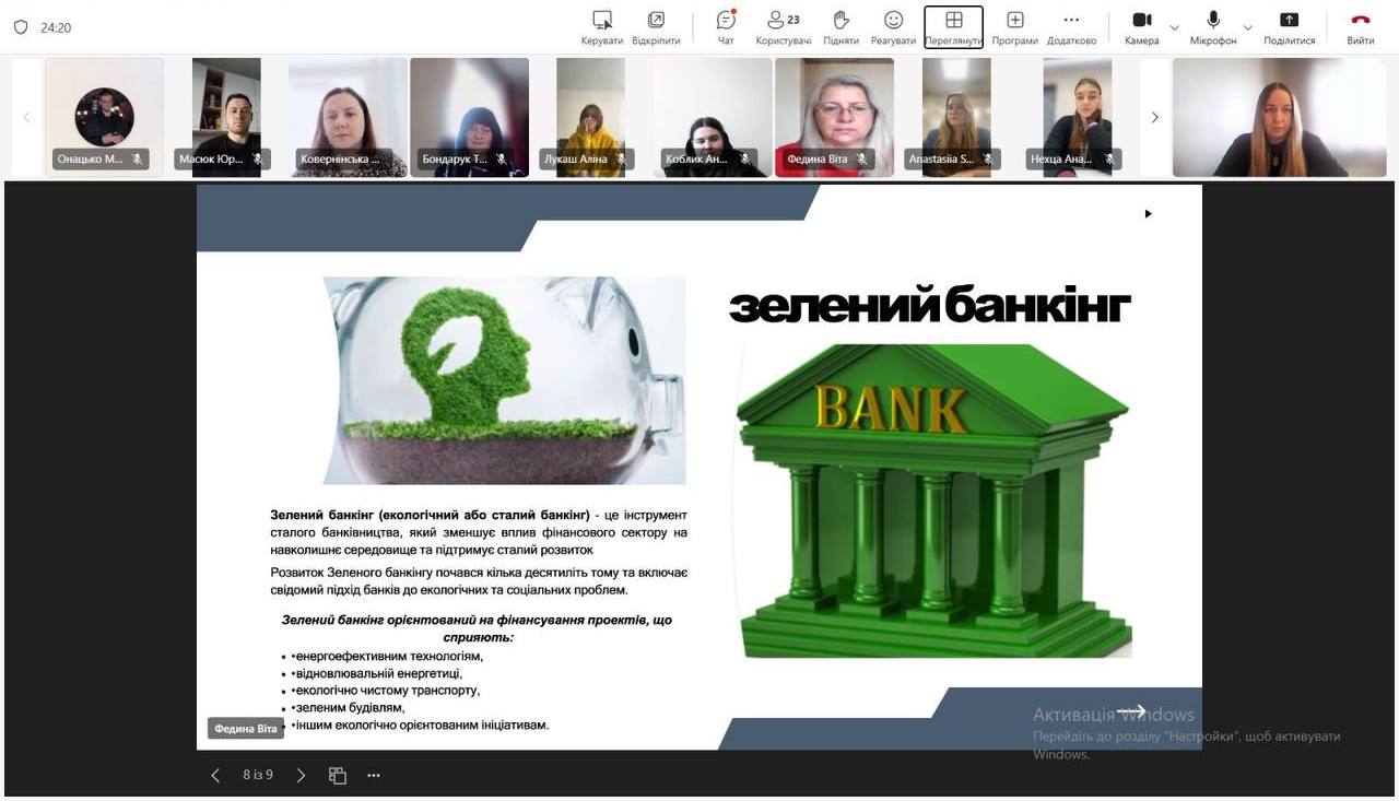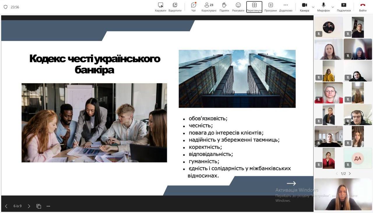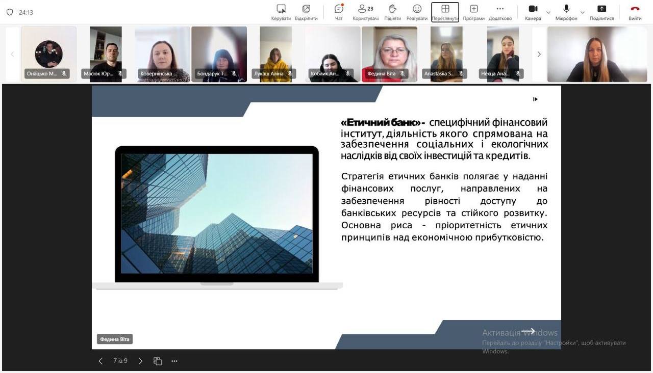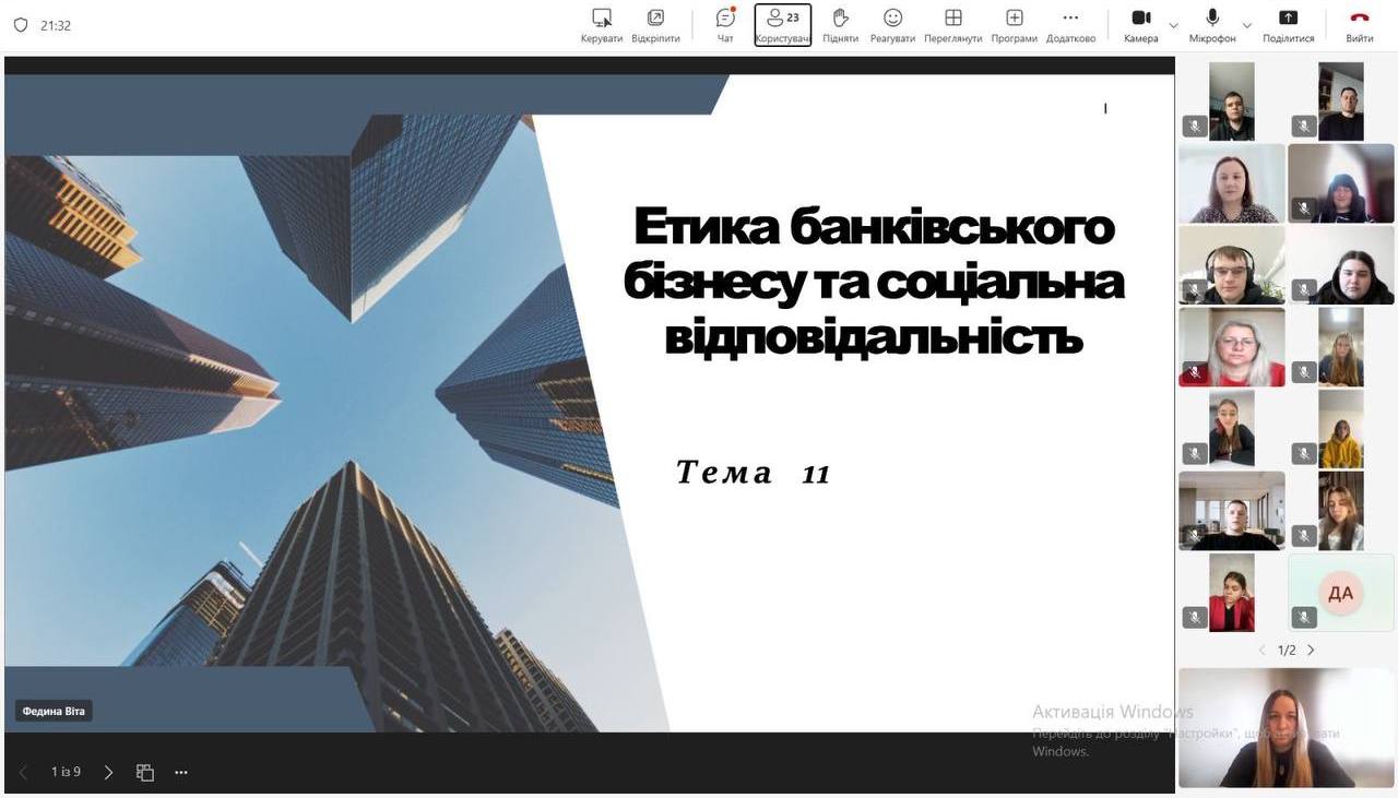 Лекторка акцентувала увагу на ролі моральних принципів та норм поведінки у банківській діяльності, важливості дотримання Кодексу честі українського банкіра, забезпеченні прозорості, доброчесності, відповідальності перед клієнтами та суспільством. Окремо було розглянуто сфери соціальної відповідальності банківського бізнесу, включаючи екологічні, соціально-економічні та етичні аспекти, а також механізми реалізації принципів сталого розвитку в банківській системі.