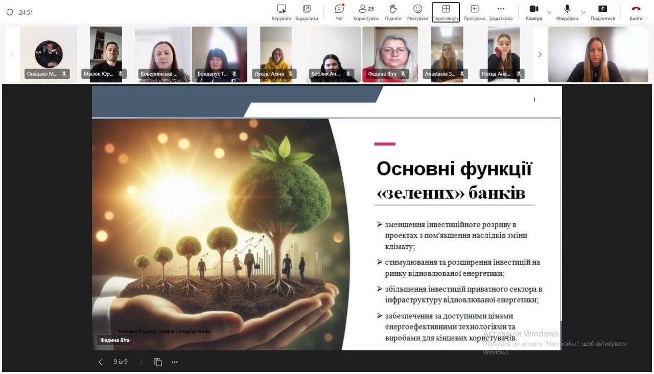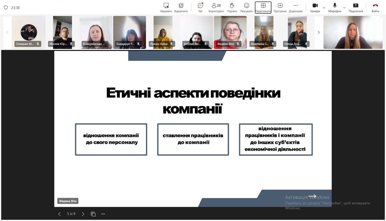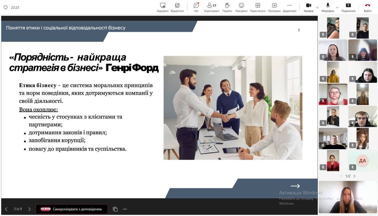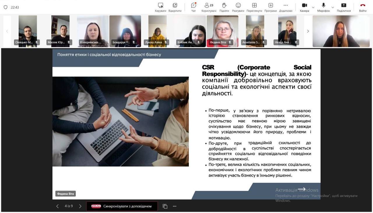 Лекторка акцентувала увагу на ролі моральних принципів та норм поведінки у банківській діяльності, важливості дотримання Кодексу честі українського банкіра, забезпеченні прозорості, доброчесності, відповідальності перед клієнтами та суспільством. Окремо було розглянуто сфери соціальної відповідальності банківського бізнесу, включаючи екологічні, соціально-економічні та етичні аспекти, а також механізми реалізації принципів сталого розвитку в банківській системі.
