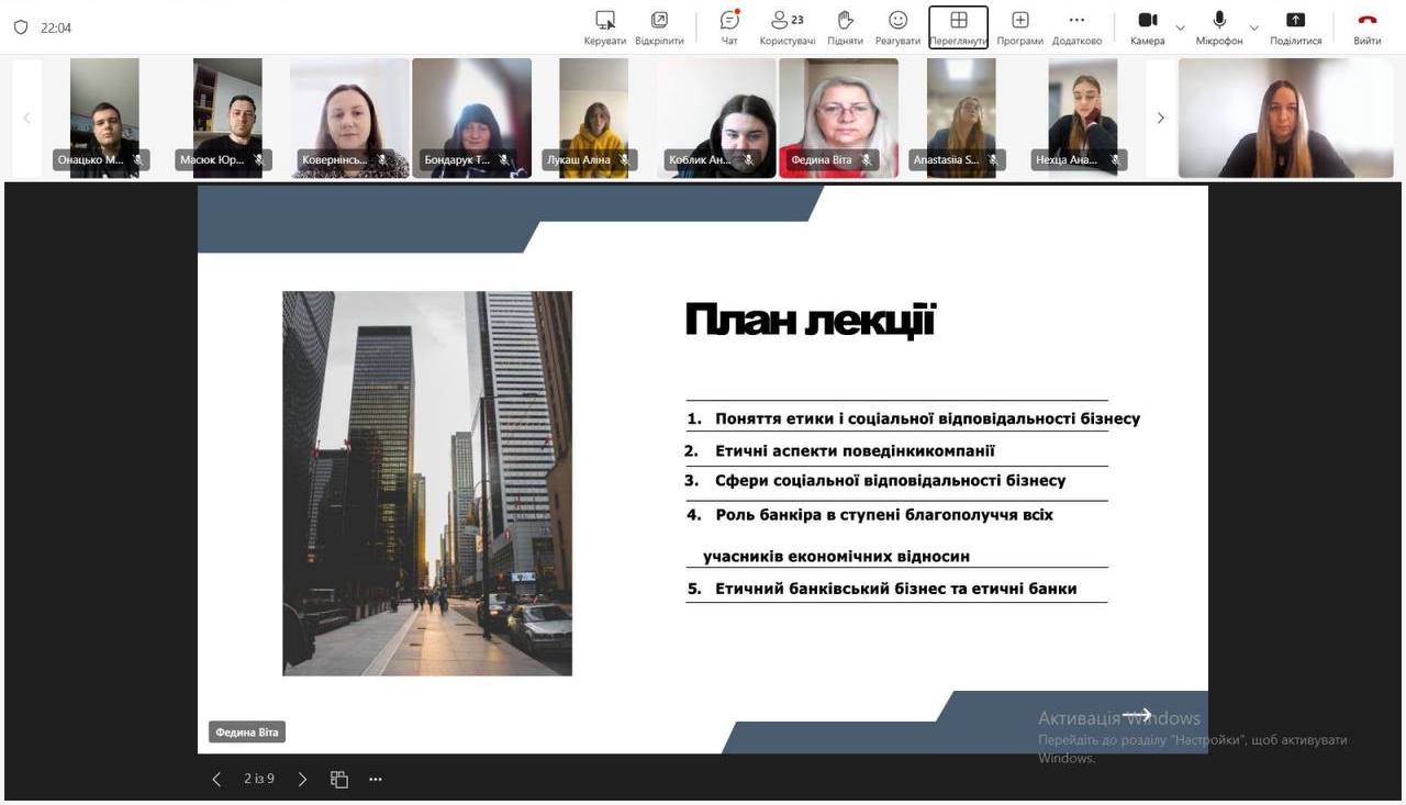 У межах лекційного заняття були опрацьовані питання сутності етики та соціальної відповідальності банківського бізнесу, етичних аспектів поведінки банківських установ, ролі банкіра у забезпеченні добробуту всіх учасників економічних відносин, а також поняття етичного банку та зеленого банкінгу як сучасних моделей відповідального фінансування.