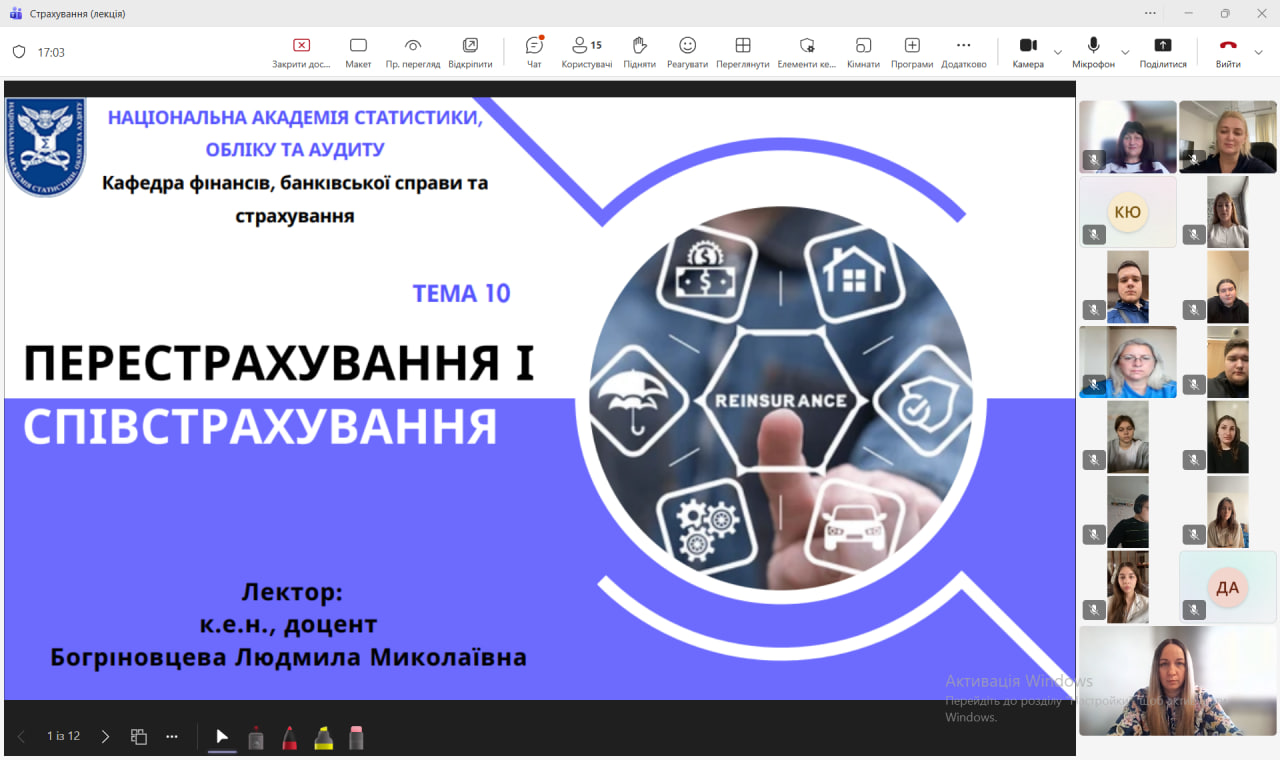 11 листопада 2025 року в Національній академії статистики, обліку та аудиту відбулася відкрита лекція к.е.н., доцента, доцента кафедри фінансів, банківської справи та страхування Людмили Богріновцевої для здобувачів першого (бакалаврського) рівня вищої освіти ОПП «Фінанси, банківська справа та страхування» з дисципліни «Страхування» на тему «Перестрахування і співстрахування».