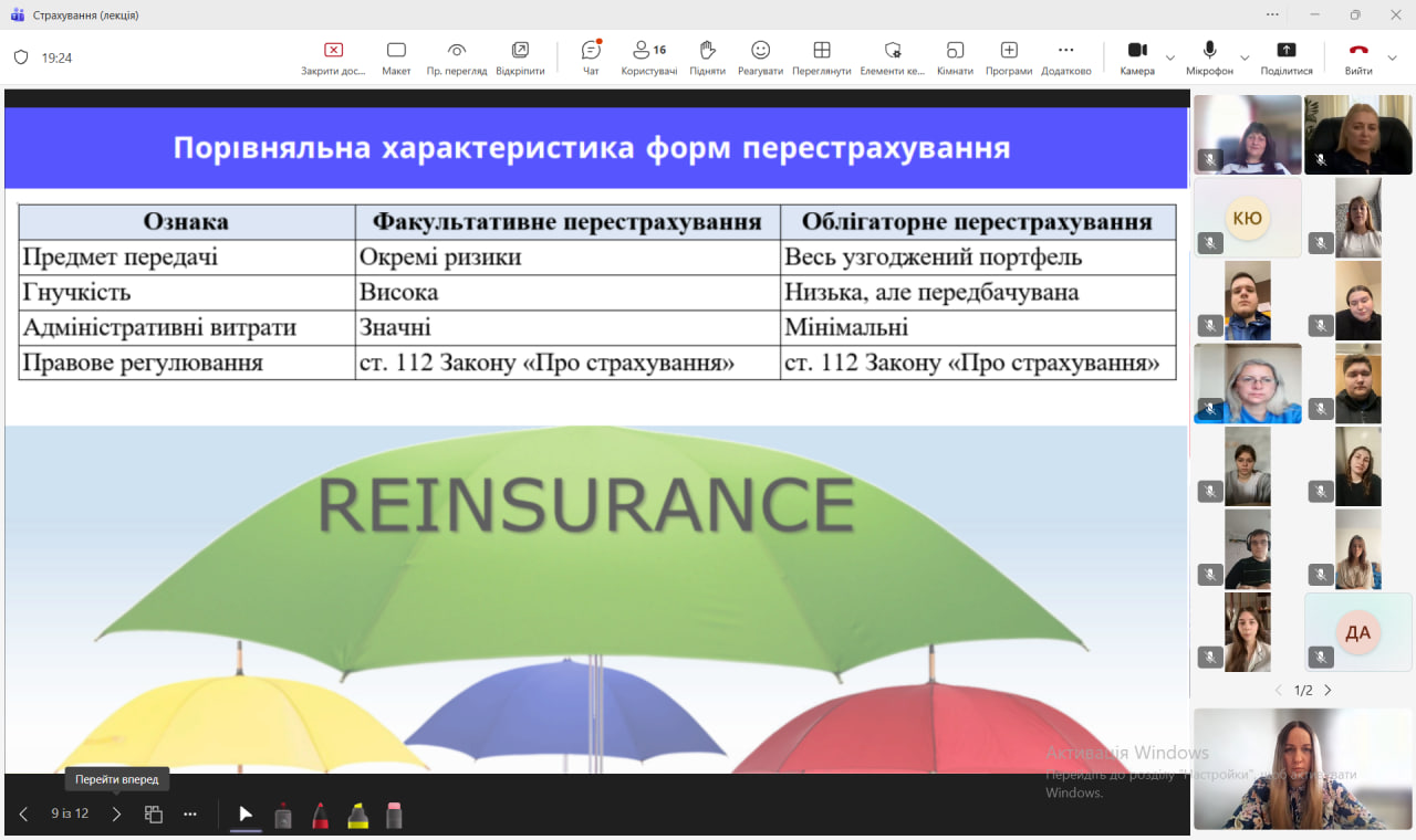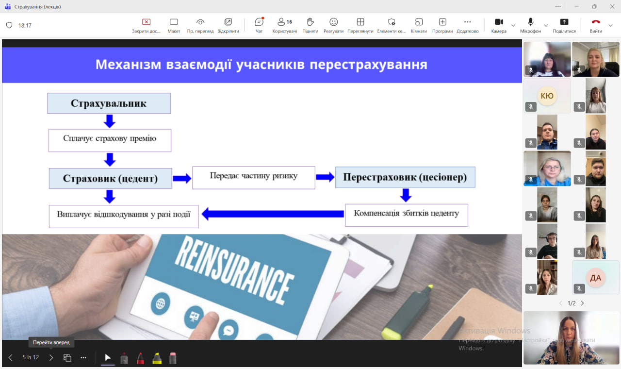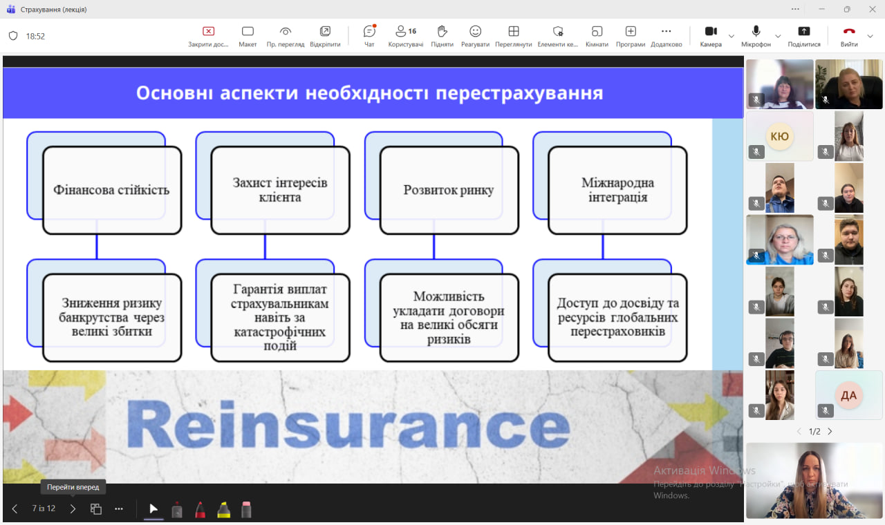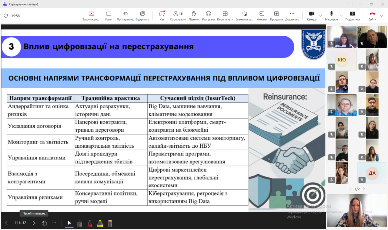 Лекція поєднувала ґрунтовний теоретичний матеріал з аналізом реальних кейсів та практичних ситуацій, що дало змогу здобувачам глибше зрозуміти логіку роботи перестрахувальних і співстрахувальних механізмів. Особливу увагу було приділено актуальним тенденціям розвитку світового та українського ринку перестрахування, включно з цифровою трансформацією страхових послуг, посиленням вимог до оцінки ризиків і зміною регуляторних підходів.