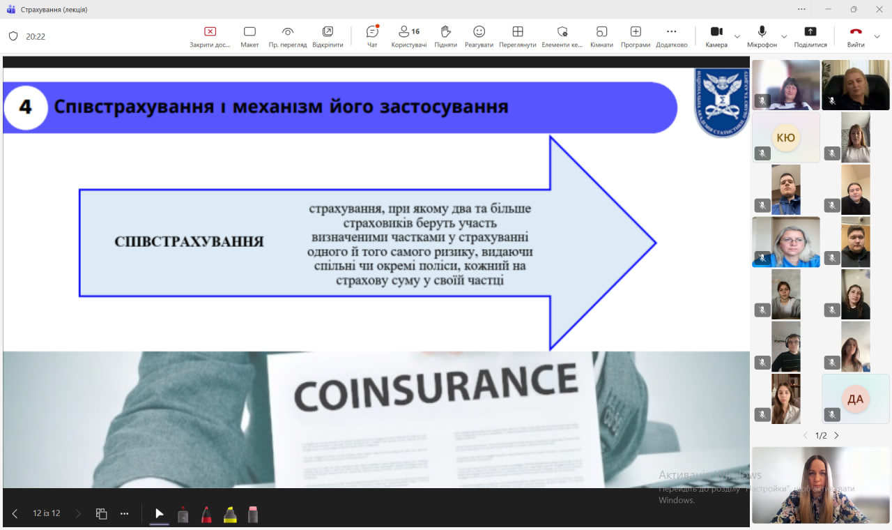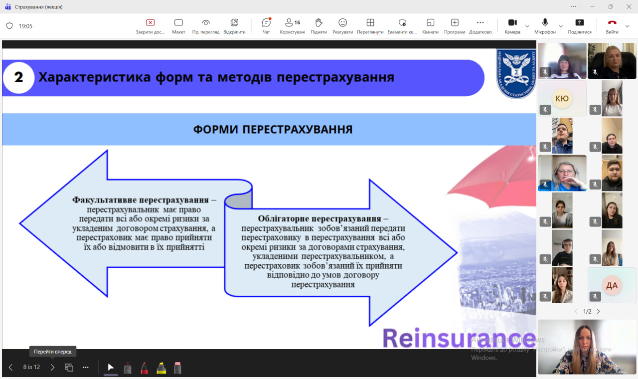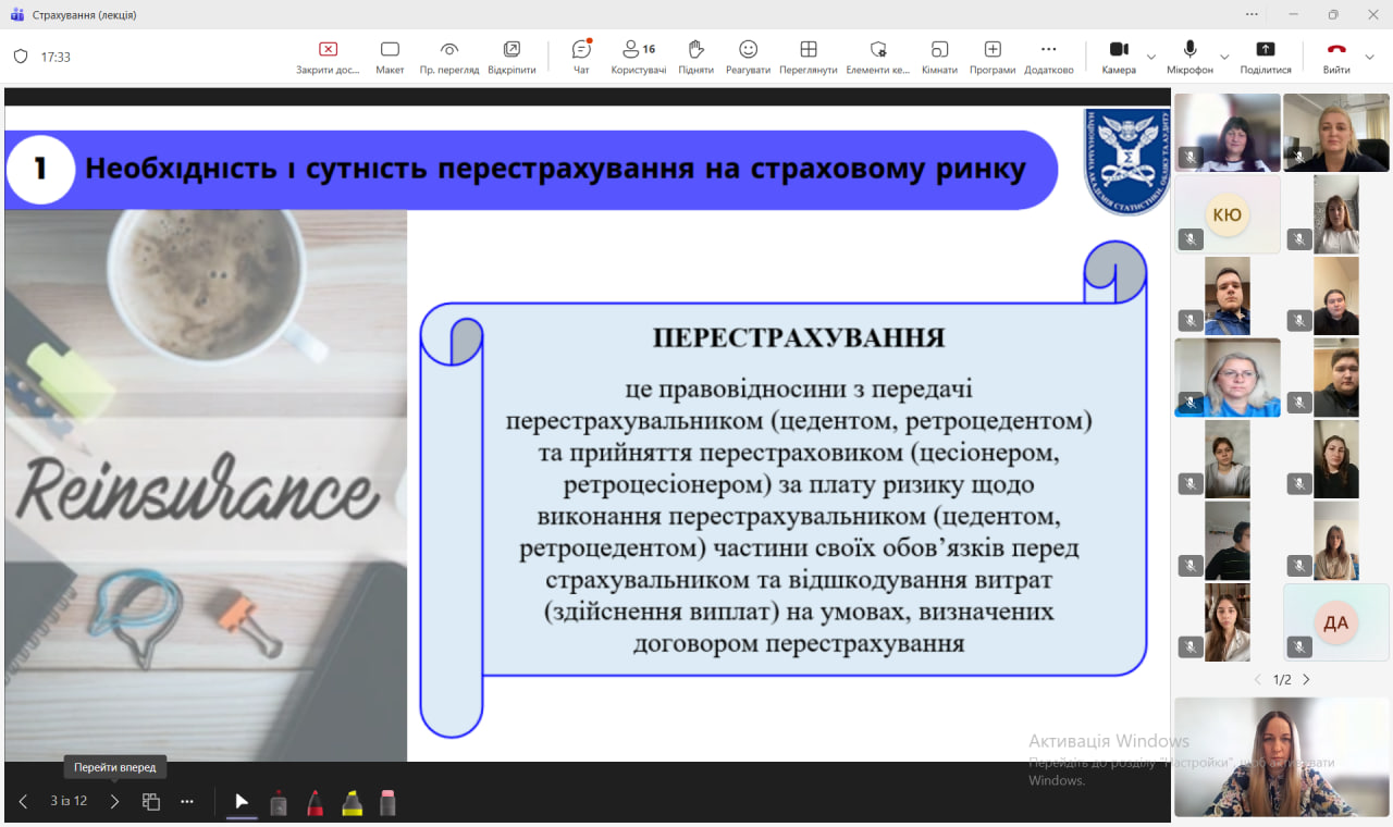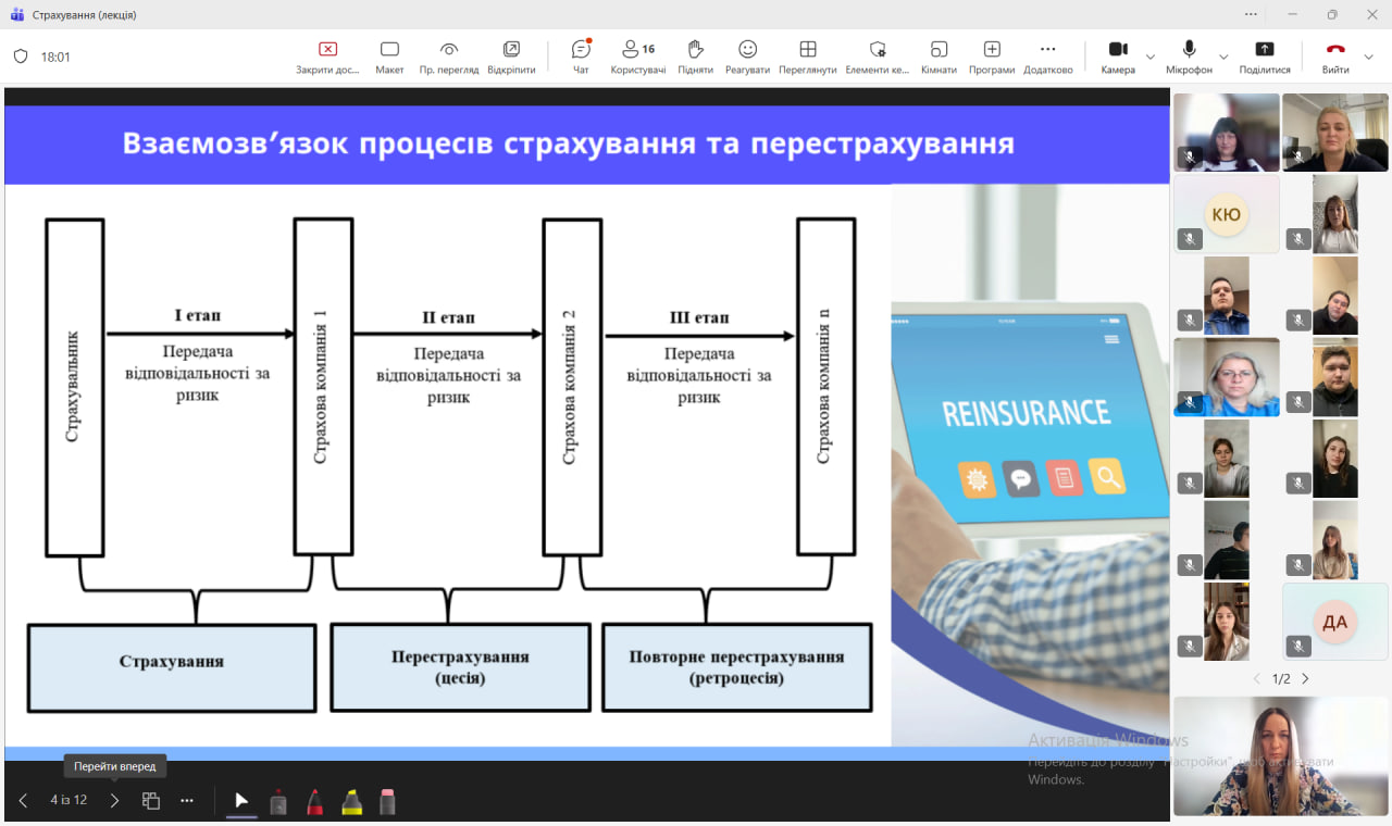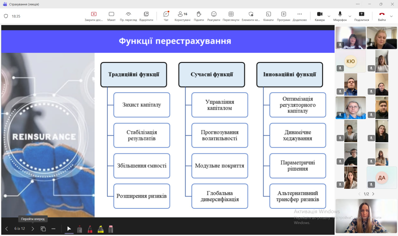 Лекція поєднувала ґрунтовний теоретичний матеріал з аналізом реальних кейсів та практичних ситуацій, що дало змогу здобувачам глибше зрозуміти логіку роботи перестрахувальних і співстрахувальних механізмів. Особливу увагу було приділено актуальним тенденціям розвитку світового та українського ринку перестрахування, включно з цифровою трансформацією страхових послуг, посиленням вимог до оцінки ризиків і зміною регуляторних підходів.
