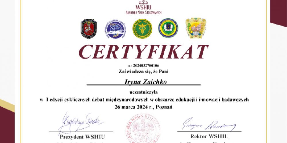 В рамках угоди про співпрацю між Національною академією статистики, обліку та аудиту та ВШТІП Академія прикладних наук (м. Познань, Республіка Польща), за результатами участі у Циклічних міжнародних дебатах в галузі освіти та наукових інновацій, які було організовано та проведено ВШТІП Академія прикладних наук (м. Познань, Республіка Польща) 26 березня 2024 року, д.е.н., професор, завідувач кафедри фінансів, банківської справи та страхування Таїсія Бондарук, к.е.н., доцент, доцент кафедри фінансів, банківської справи та страхування Людмила Богріновцева та к.е.н., доцент, доцент кафедри фінансів, банківської справи та страхування Ірина Заїчко отримали сертифікати про участь у дебатах.