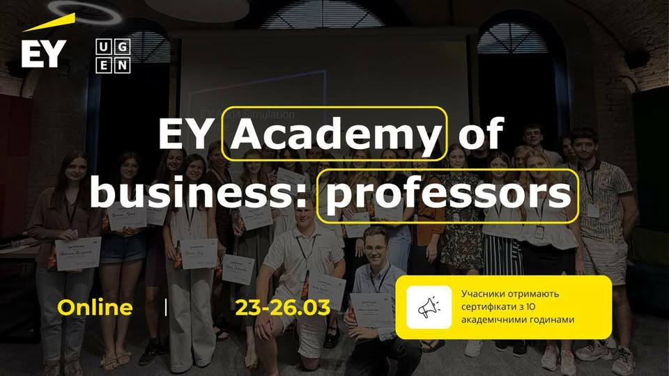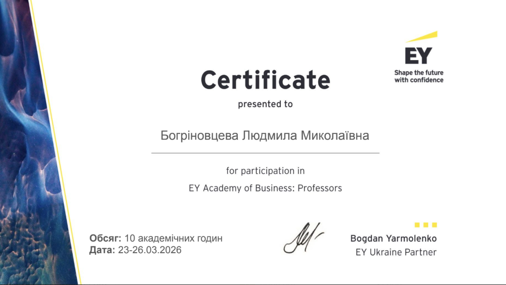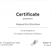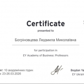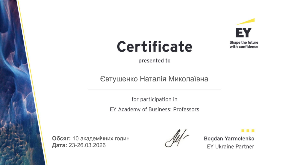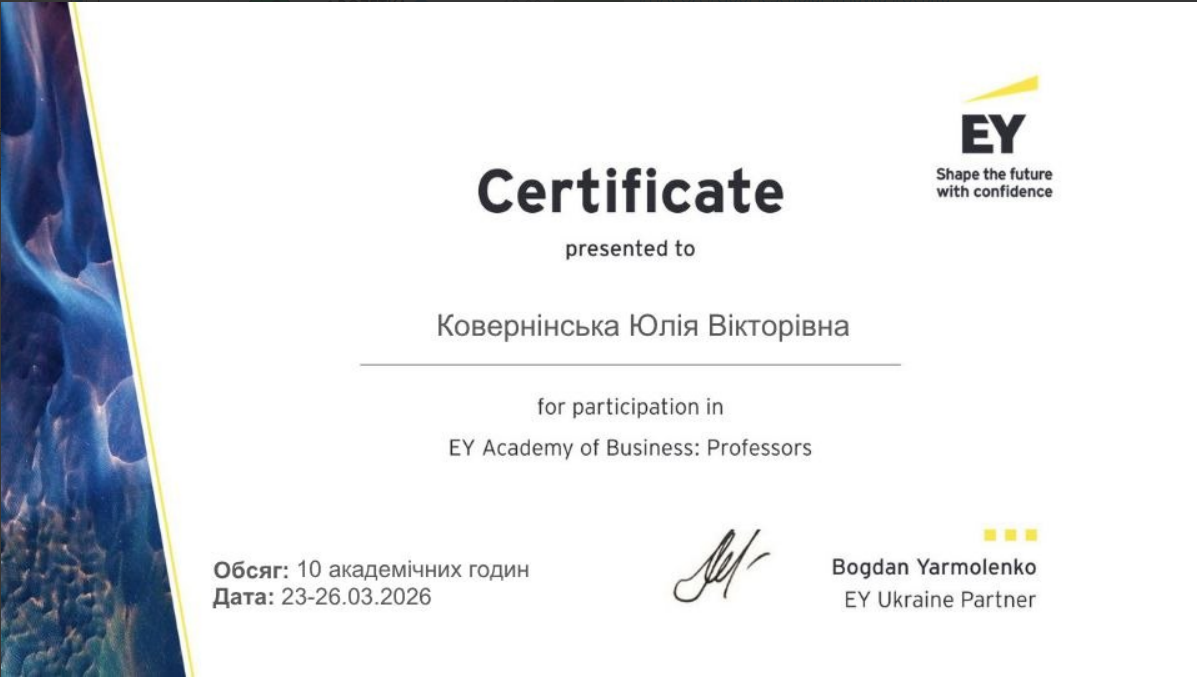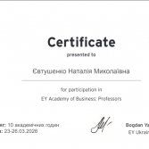 У період 23-26 березня 2026 року к.е.н., доцент, проректор з науково-педагогічної роботи Наталія Євтушенко, а також к.е.н., доценти, доценти кафедри фінансів, банківської справи та страхування Людмила Богріновцева, Юлія Ковернінська та Віта Федина взяли участь в освітньому проєкті EY Academy of Business: Professors.