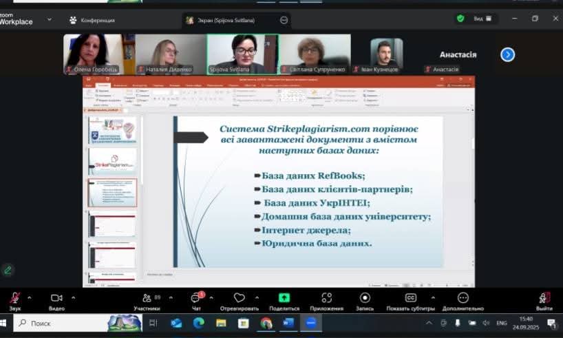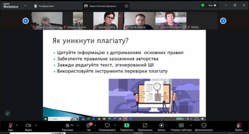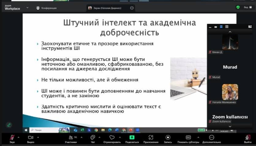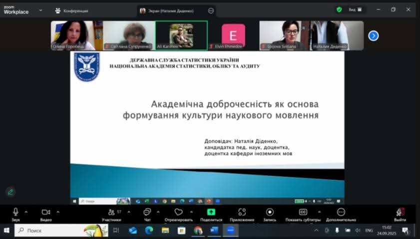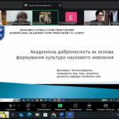 - Наталя Діденко, к.філол.н., доцент, доцент кафедри іноземних мов, розкрила тему «Академічна доброчесність як основа формування культури наукового мовлення». Центральною темою її виступу було питання правильного цитування, уникнення плагіату, формування культури академічної відповідальності та розвиток навичок коректного використання джерел у студентських і наукових роботах.