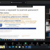 - Світлана Спіжова – директор бібліотеки НАСОА, представила практичну доповідь «Інструменти забезпечення академічної доброчесності», у якій йшлося про сучасні цифрові сервіси перевірки текстів, ресурси бібліотеки для академічної підтримки студентів та викладачів, а також про роль інформаційної культури у дотриманні стандартів доброчесності.