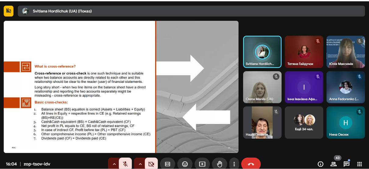 01.04.2025 р. у рамках партнерства з Прикарпатським національним університетом ім. Василя Стефаника науково-педагогічні працівники кафедри обліку, аудиту та оподаткування Національної академії статистики, обліку та аудиту разом із здобувачами вищої освіти освітнього ступеня «магістр» та «бакалавр» приєднались до зустрічі з представниками PricewaterhouseCoopers (PwC) Lviv SDC і прослухали гостьову лекцію на тему «Фінансова звітність: складові та перевірка у контексті міжнародних стандартів» в межах ОК «Звітність підприємств» та ОК «Облік і фінансова звітність за міжнародними стандартами». Під час зустрічі здобувачі вищої освіти ознайомилися з основними напрямами діяльності міжнародної організації PwC Lviv SDC, яка є учасницею міжнародної мережі фірм PwC, де у 149 країнах працює понад 370000 фахівців, що пропонують професійні послуги у сфері менеджмент-консалтингу та аудиту.