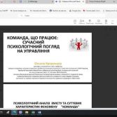Грунтуючись на досвіді управлінської діяльності різних організацій, Оксана Валеріївна визначила основні принципи командної роботи, розкрила рольову структуру, позиції, функції лідера та стилі управління.