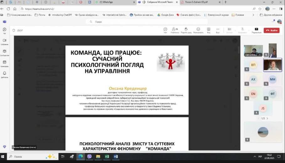 22 вересня за ініціативи к.пед.н., доцента, доцента кафедри філософії та соціально-гуманітарних наук Черушевої Г. Б. в рамках вивчення курсу «Психологія управління» відбулася гостьова зустріч здобувачів вищої освіти другого (магістерського) рівня освітніх програм «Менеджмент зовнішньоекономічної діяльності», «Прикладна статистика та бізнес-аналітика», «Облік, аудит та опадаткування», «Фінанси, банківська справа та страхування» з д.психол.н., професором, завідувачем відділу соціальної психології особистості Інституту соціальної та політичної психології НАПН України, діючим членом Виконавчої Дирекції Української Асоціації організаційних психологів та психологів праці (УАОППП) – Оксаною Креденцер.