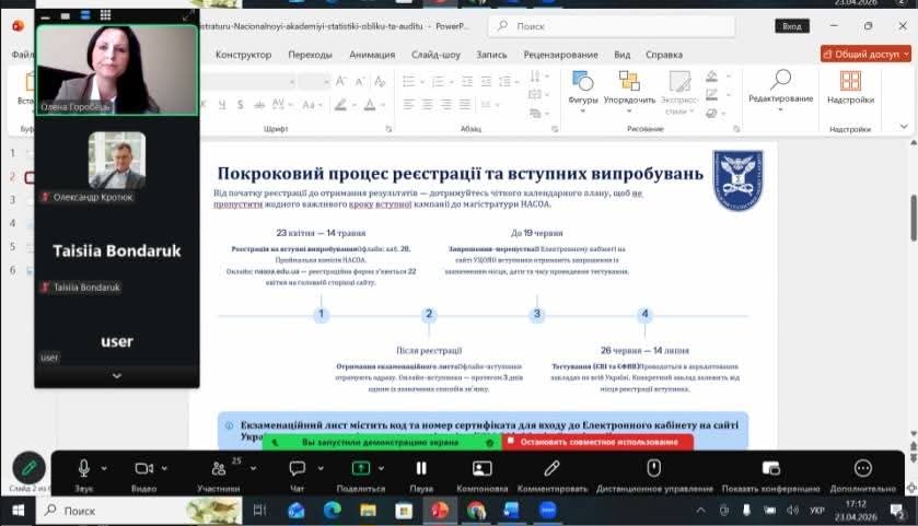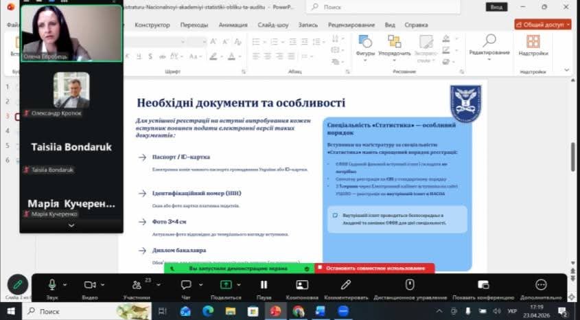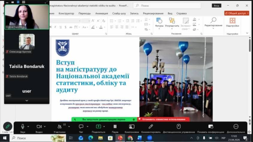 23 квітня проректор Національної академії статистики, обліку та аудиту, к.е.н., доцент Горобець О.О., з метою надання консультацій зустрілася зі здобувачами вищої освіти першого (бакалаврського) рівня четвертого року навчання Академії, які виявили бажання вступати до магістратури.