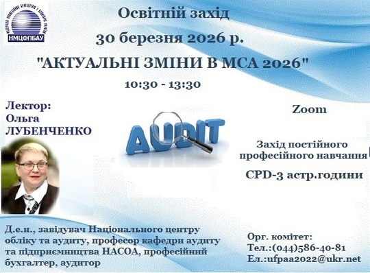 30 березня 2026 року Федерація професійних бухгалтерів і аудиторів України провела освітній захід для аудиторів «Актуальні зміни в МСА 2026». Спікером заходу виступила Лубенченко Ольга д. е. н., професор, завідувач Національного центру обліку та аудиту, Національної академії статистики, обліку та аудиту, практикуючий аудитор.