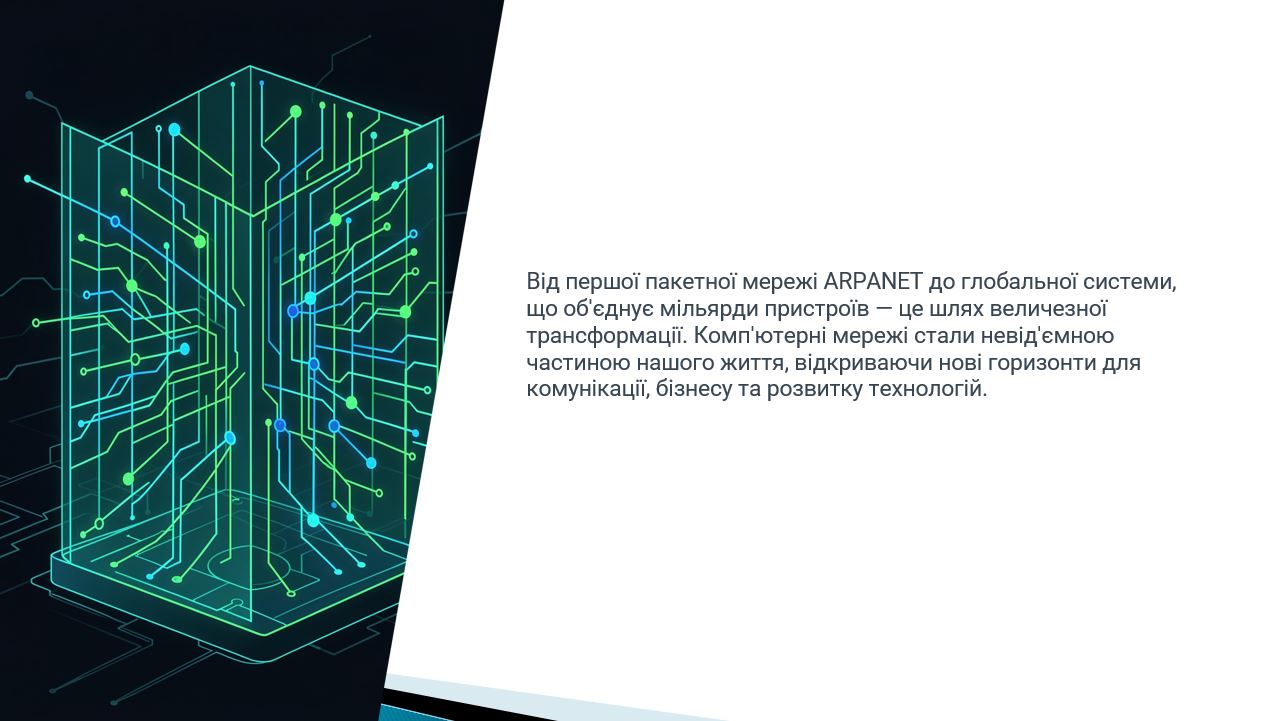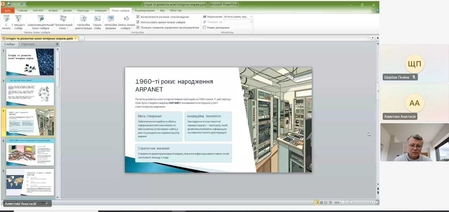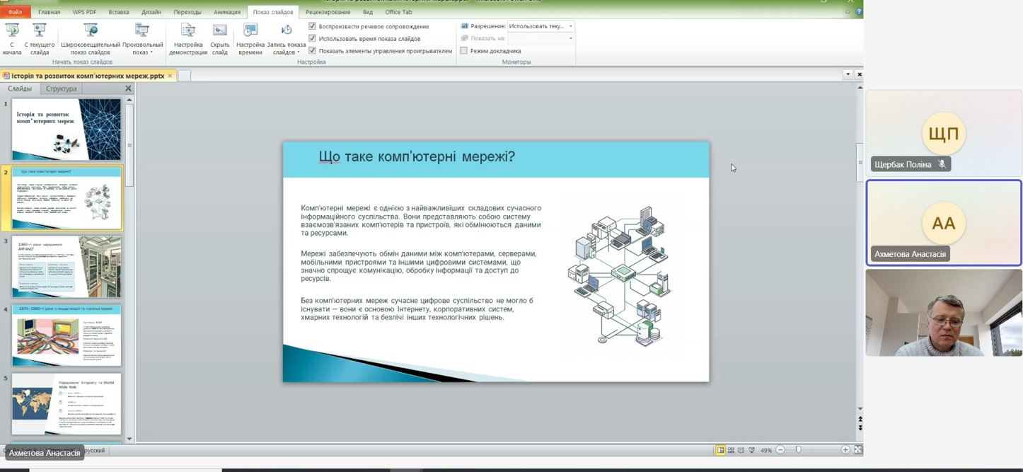 Під час засідання було розглянуто ключові етапи становлення комп’ютерних мереж – від перших експериментів з передавання даних та створення мережі ARPANET до формування глобальної мережі Інтернет і сучасних високошвидкісних мережевих технологій. Особливу увагу було приділено еволюції мережевих протоколів, архітектурі клієнт–сервер, розвитку локальних та глобальних мереж, а також ролі хмарних технологій і бездротових мереж у сучасному цифровому світі.