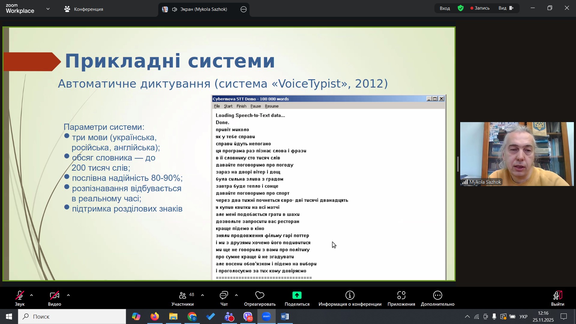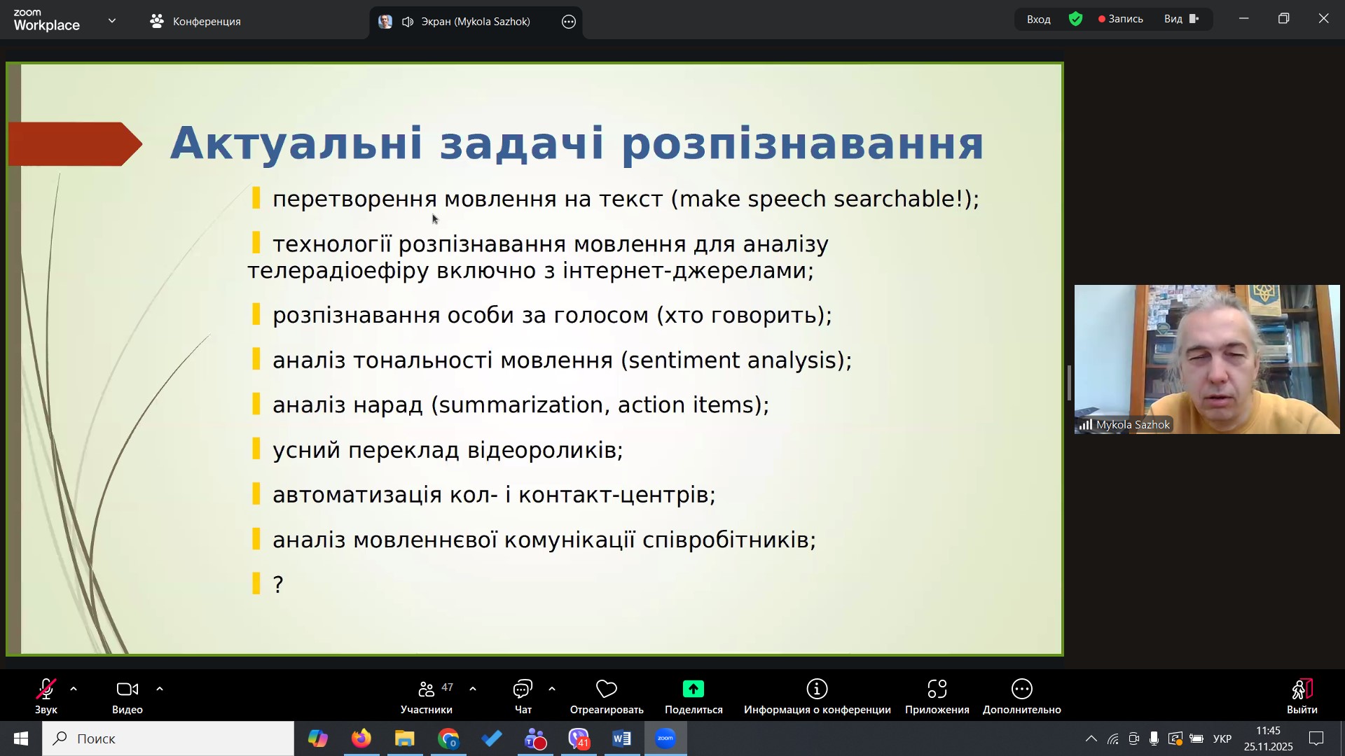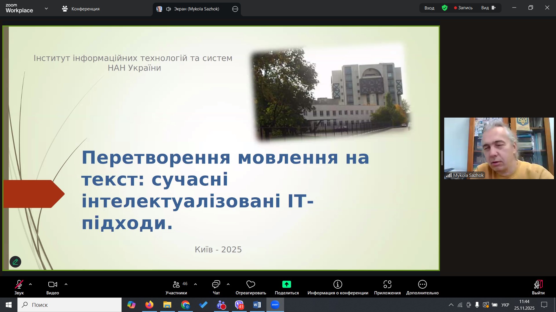 Головним доповідачем був доктор технічних наук, завідувач відділу розпізнавання та синтезу звукових образів Інституту інформаційних технологій та систем НАН України – Микола Миколайович Сажок. У своїй доповіді він ґрунтовно розкрив сучасні методи та алгоритми, що дозволяють перетворювати живе мовлення на текстові дані з високим рівнем точності. Особливу увагу було приділено застосуванню штучного інтелекту, машинного навчання та нейронних мереж у сфері автоматичного розпізнавання мовлення.