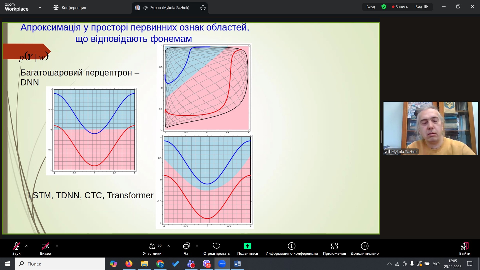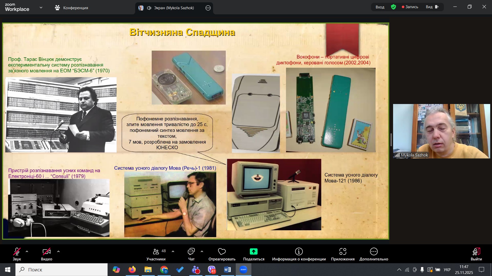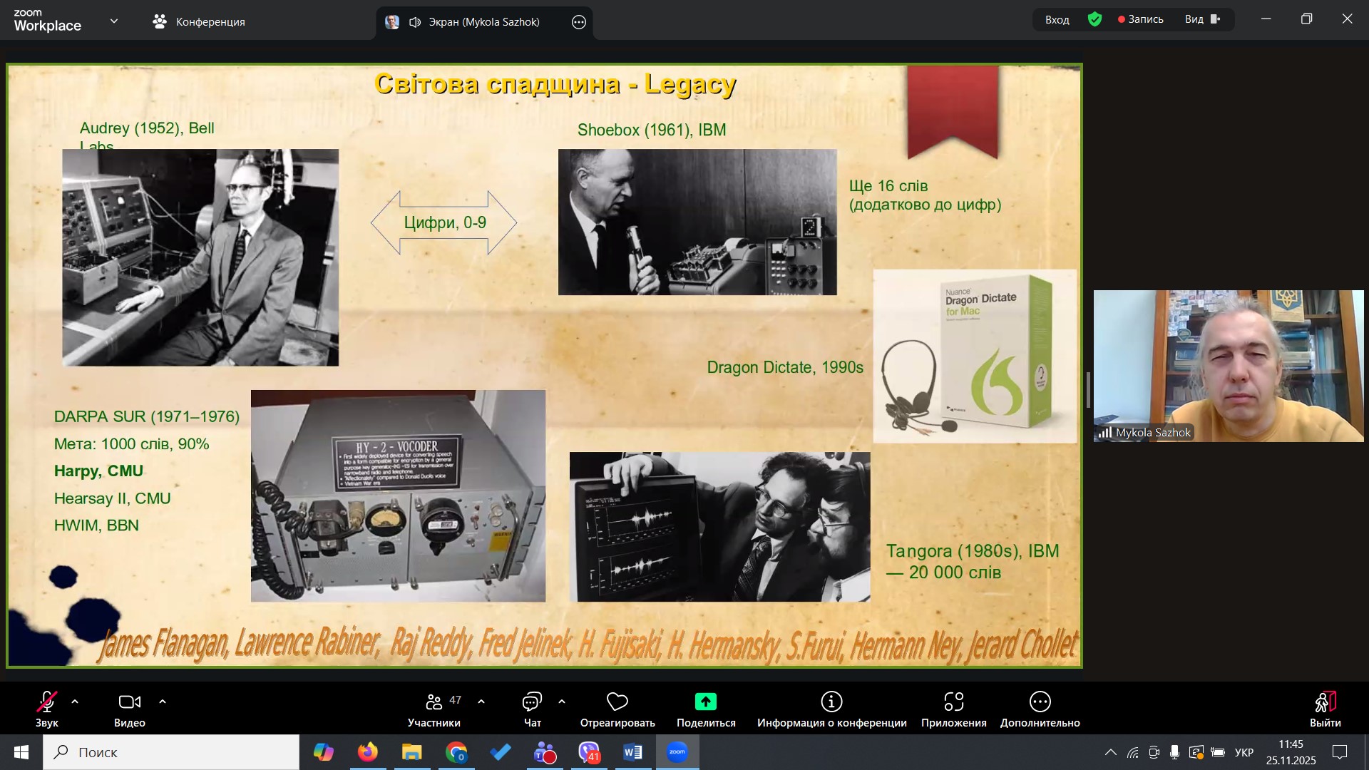 Головним доповідачем був доктор технічних наук, завідувач відділу розпізнавання та синтезу звукових образів Інституту інформаційних технологій та систем НАН України – Микола Миколайович Сажок. У своїй доповіді він ґрунтовно розкрив сучасні методи та алгоритми, що дозволяють перетворювати живе мовлення на текстові дані з високим рівнем точності. Особливу увагу було приділено застосуванню штучного інтелекту, машинного навчання та нейронних мереж у сфері автоматичного розпізнавання мовлення.