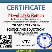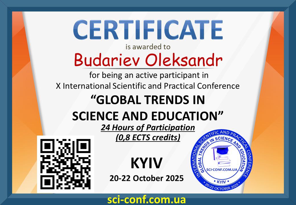 Заслухали також наукові доповіді здобувача освіти 2 курсу спеціальності «Менеджмент» Новохацького Романа «Мовна культура менеджера як чинник формування його професійного успіху» та здобувача освіти 2 курсу спеціальності «Фінанси, банківська справа та фондовий ринок» Бударьова Олександра на тему «Використання української мови у професійній діяльності економіста». Щиро вітаємо студентів, що активно долучилися до X Міжнародної онлайнової науково-практичної конференції «Global trends in science and education» (20 жовтня 2025 р.), опублікували тези виступів і одержали сертифікати участі!