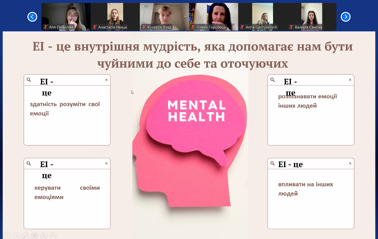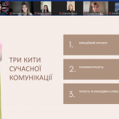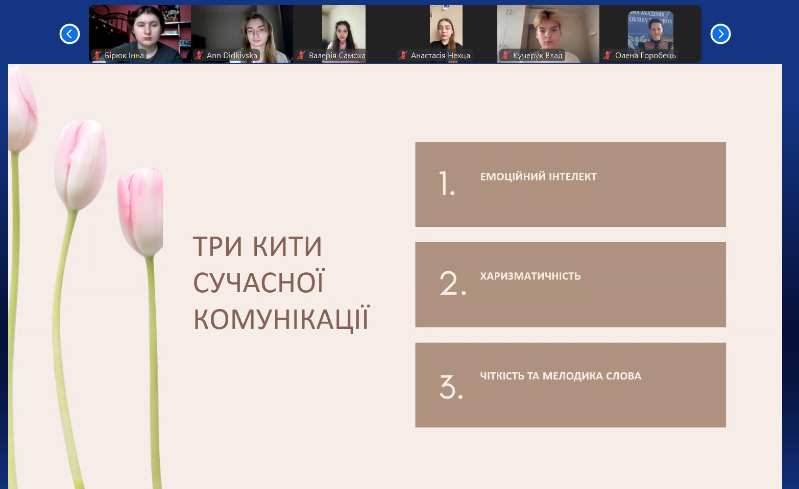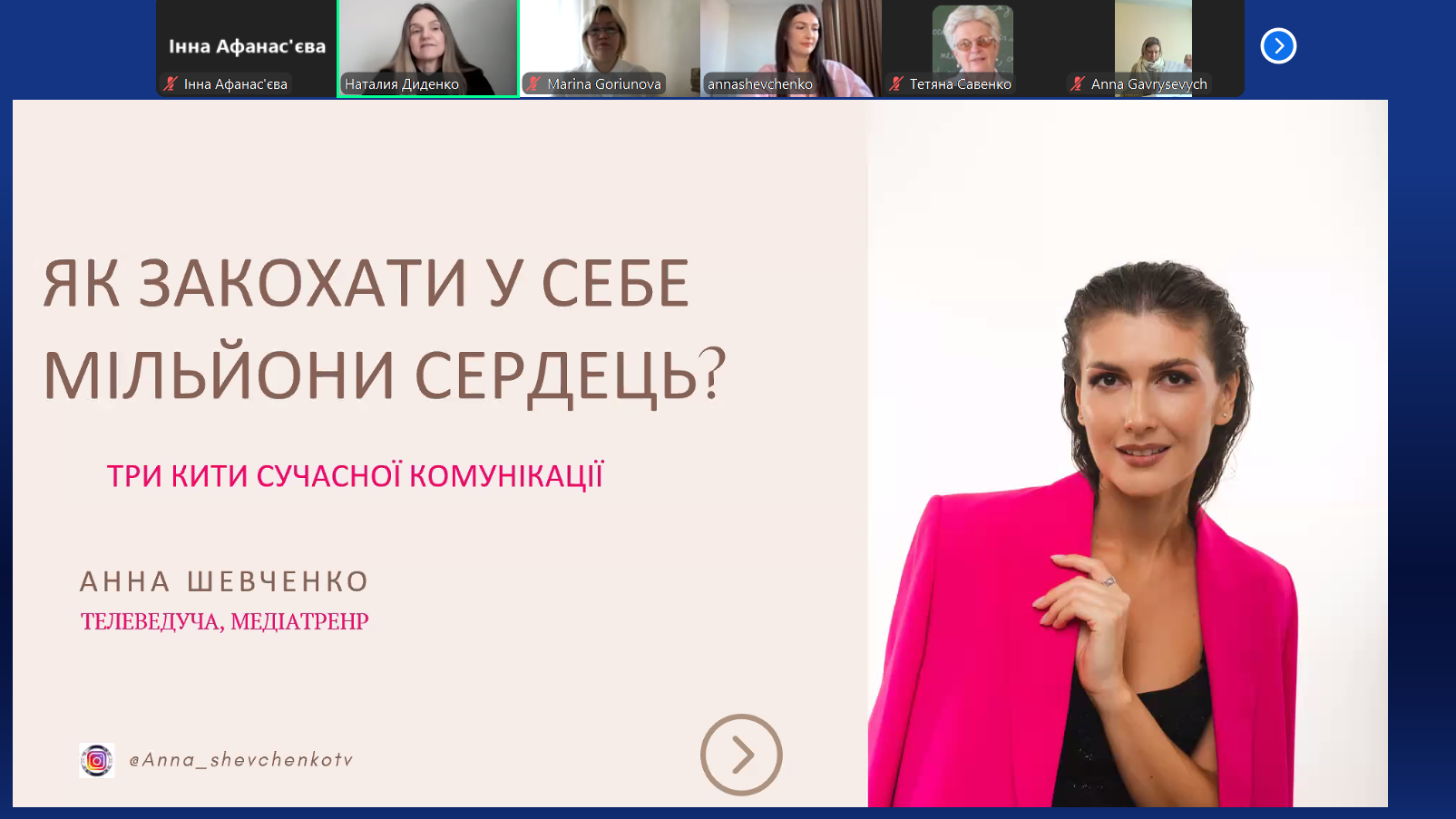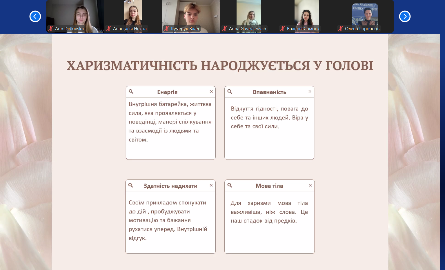 Анна надала поради щодо розвитку Soft Skils, створення відеорезюме, використання комплексного підходу до розвитку емоційного інтелекту і харизматичності, використання мови тіла та ритму мовлення. Здобувачі отримали відповіді на питання, які їх цікавлять й турбують. Дякуємо модератору НАТАЛІЇ ДИДЕНКО, канд. пед. наук, доценту за організацію зустрічі та окрема подяка АННІ ШЕВЧНКО за чудові приклади, цінні поради та позитивні емоції. Чекаємо на наступні зустрічі!