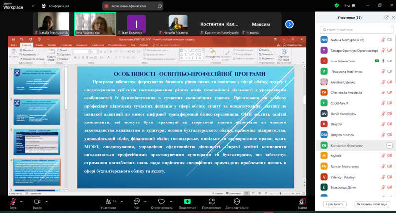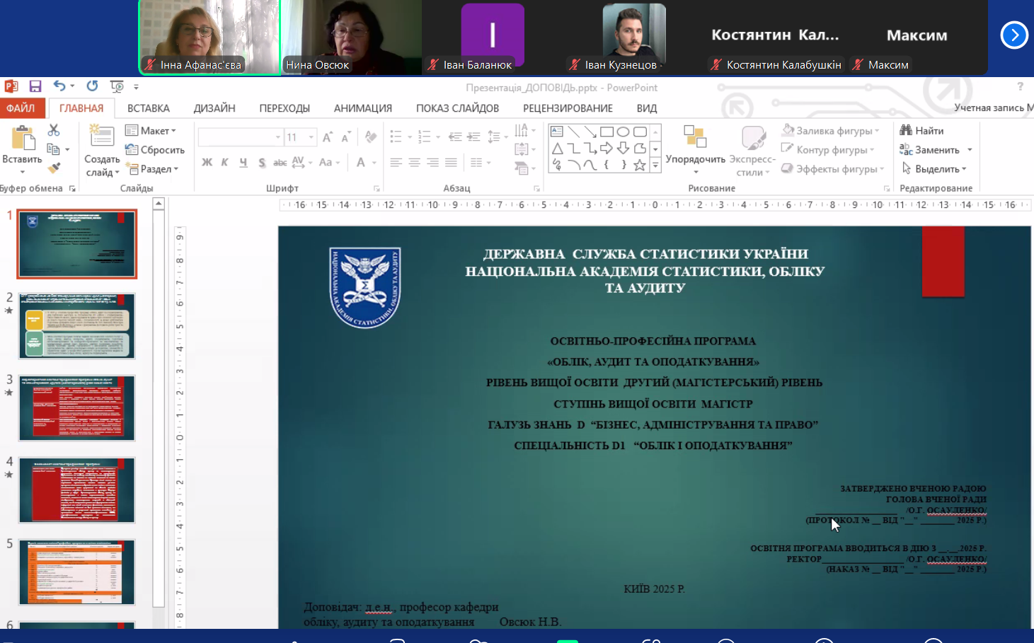 29 квітня 2025 кафедрою обліку, аудиту та оподаткування НАСОА було організовано круглий стіл, присвячений оновленню ОПП «Облік, аудит та оподаткування» спеціальності D1 «Облік і оподаткування». До завершального етапу обговорення проєкту освітньо-професійних програм приєдналися здобувачі вищої освіти, викладачі кафедри та випускники, практики у сфері обліку, оподаткування і аудиту та представники наукової спільноти. Оновлення ОПП відбувається з урахуванням нового переліку галузей знань і спеціальностей; моніторингу ринку праці та пропозицій різних груп стейкхолдерів. Позитивну оцінку освітньо-професійним програмам та пропозиції щодо удосконалення ОПП надали наступні представники ЗВО, експерти з обліку, аудиту та оподаткування:
